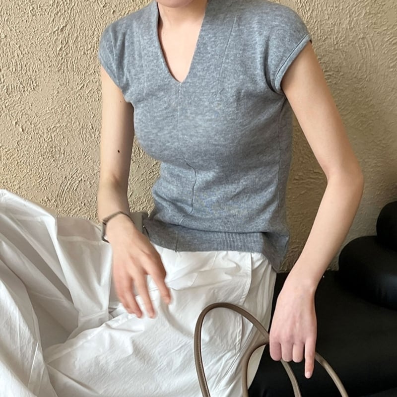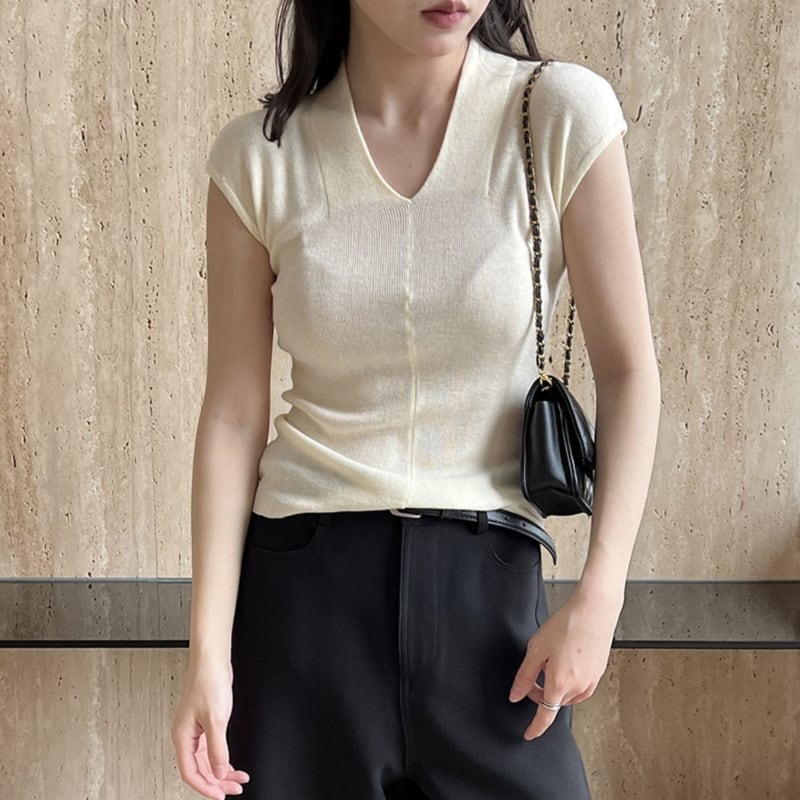 上品なVネックと、体に程よくフィットするタイトなシルエットが魅力のトップス。