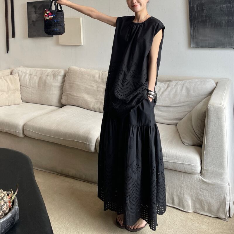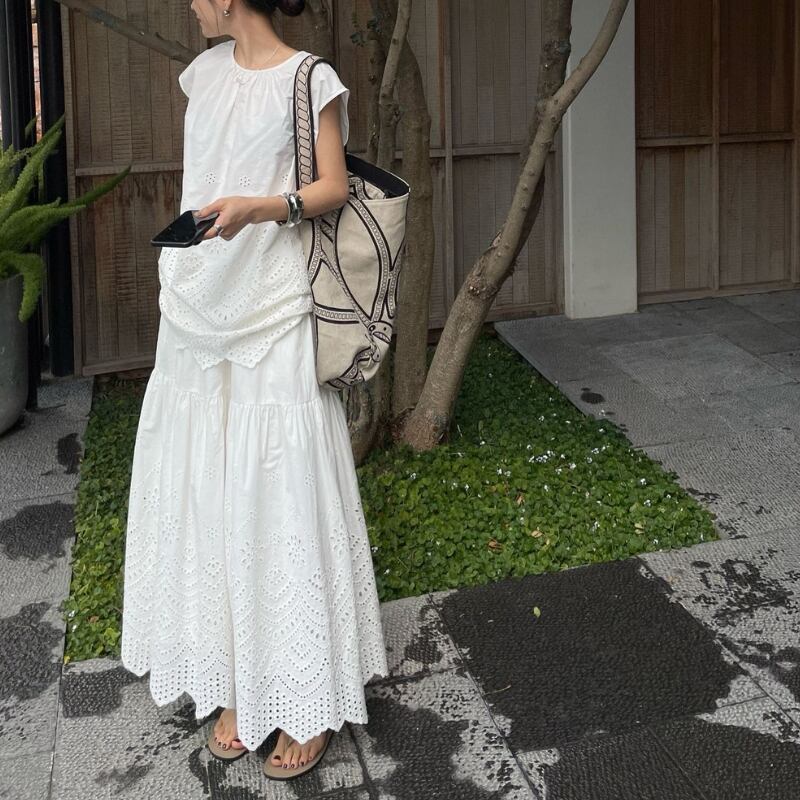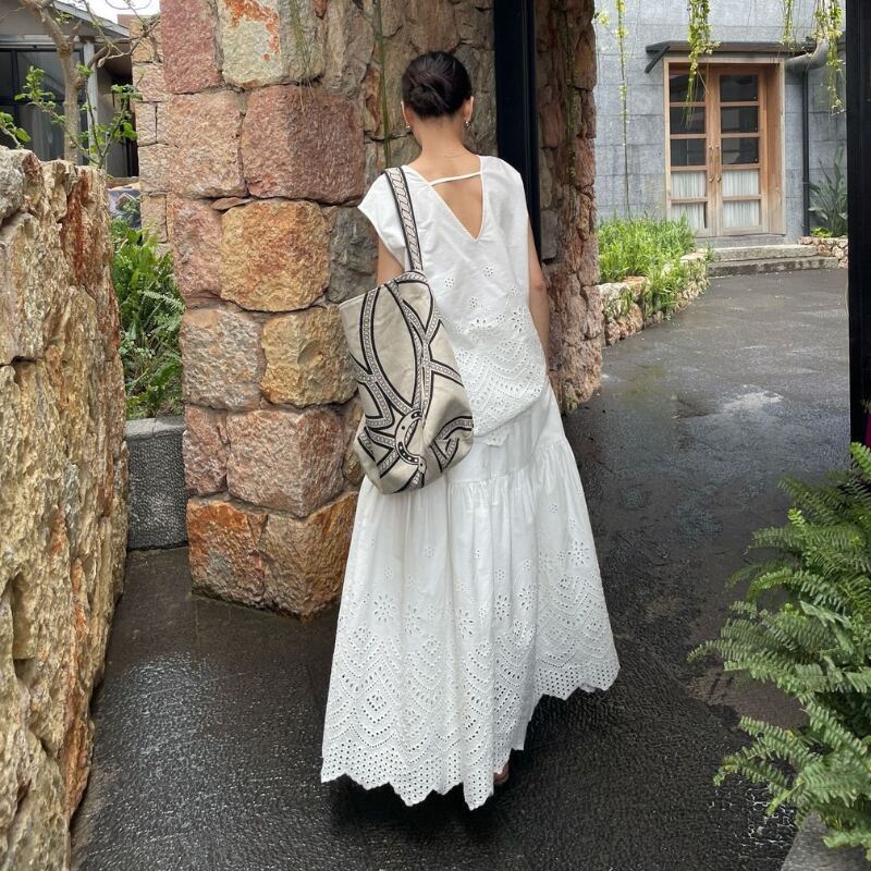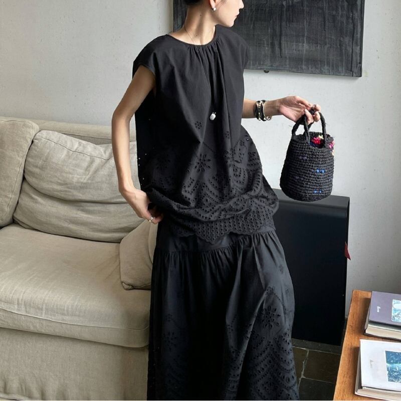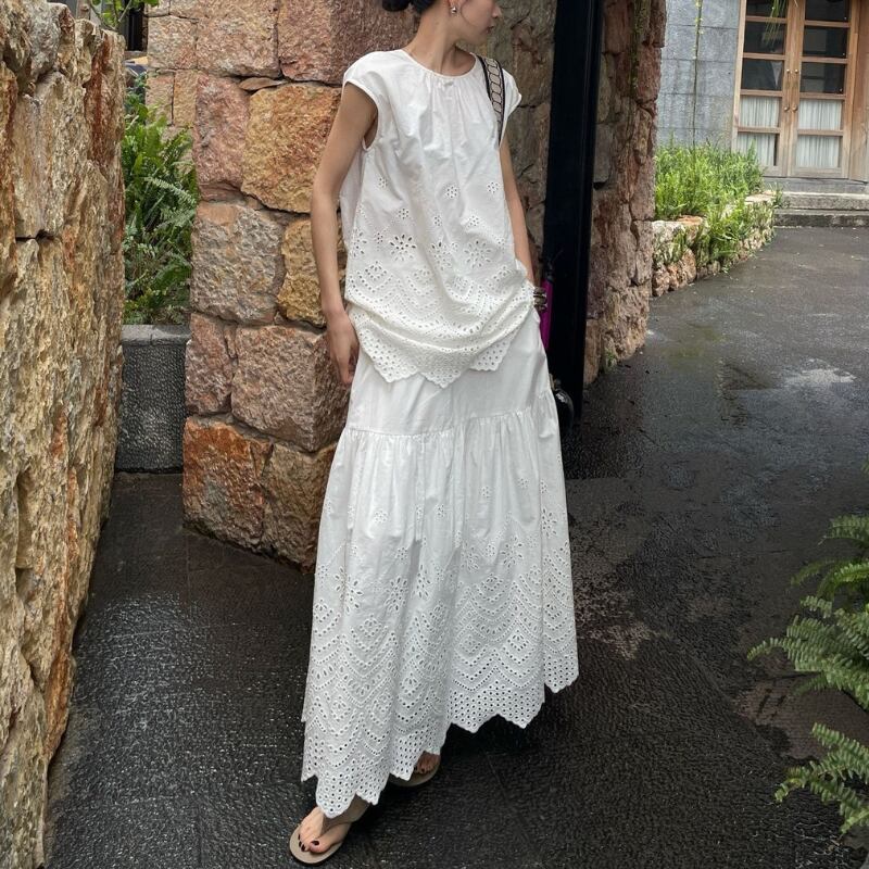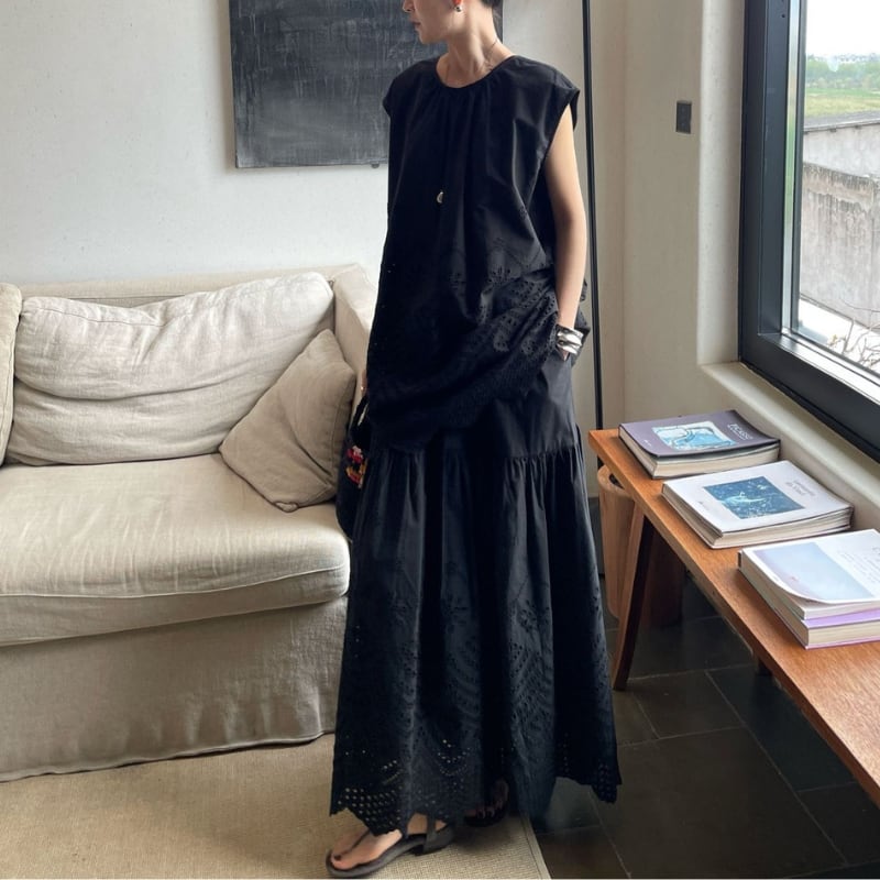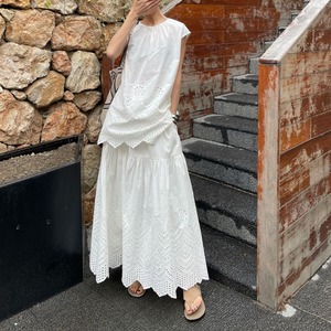 アイレット刺繍が美しいバックVトップスとロングスカートのセットアップ。