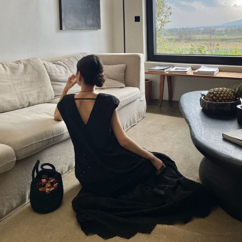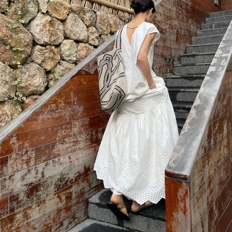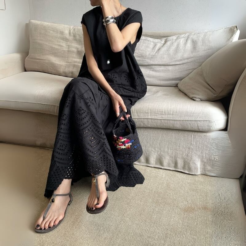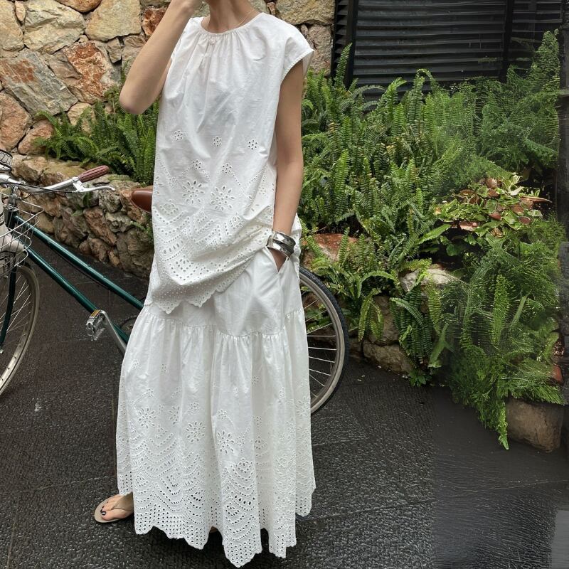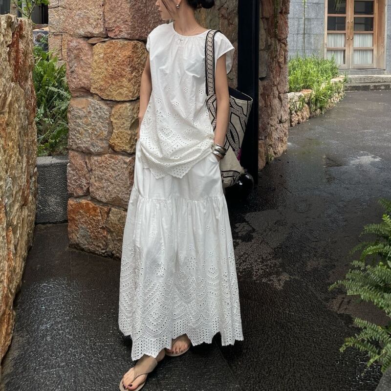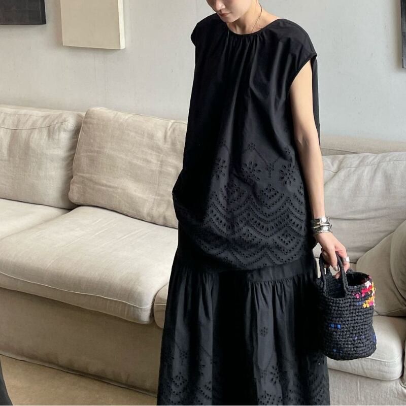 アイレット刺繍が美しいバックVトップスとロングスカートのセットアップ。