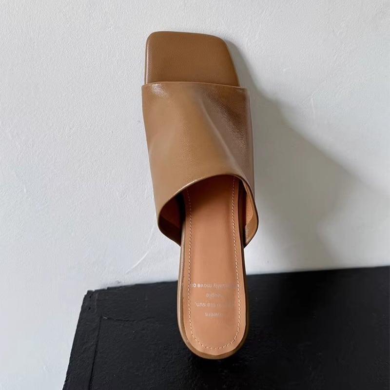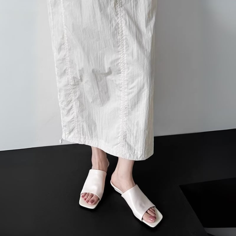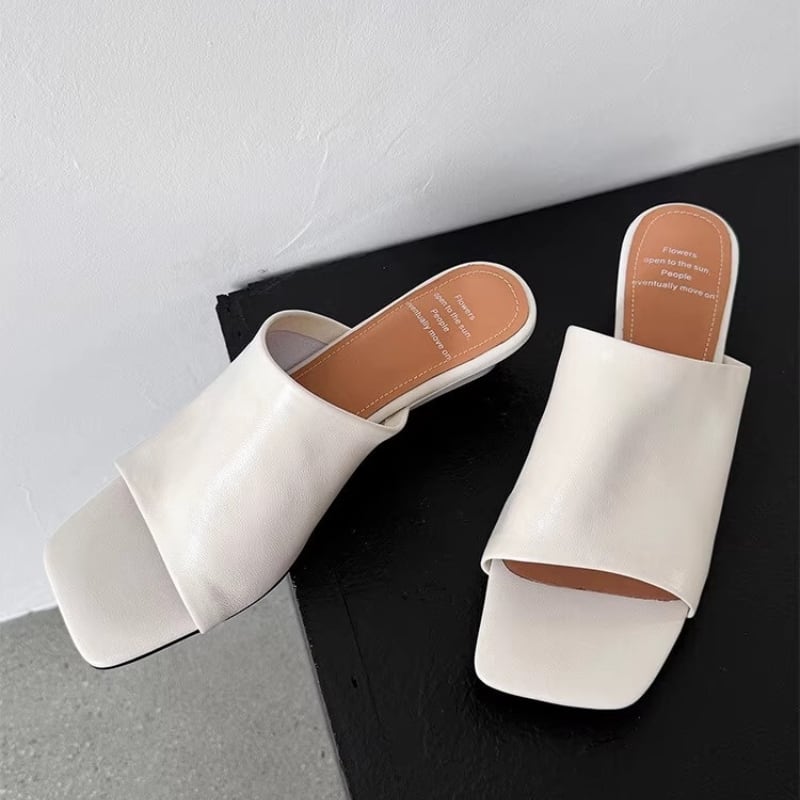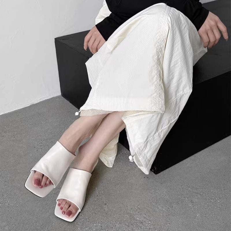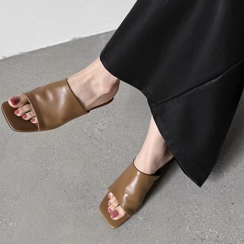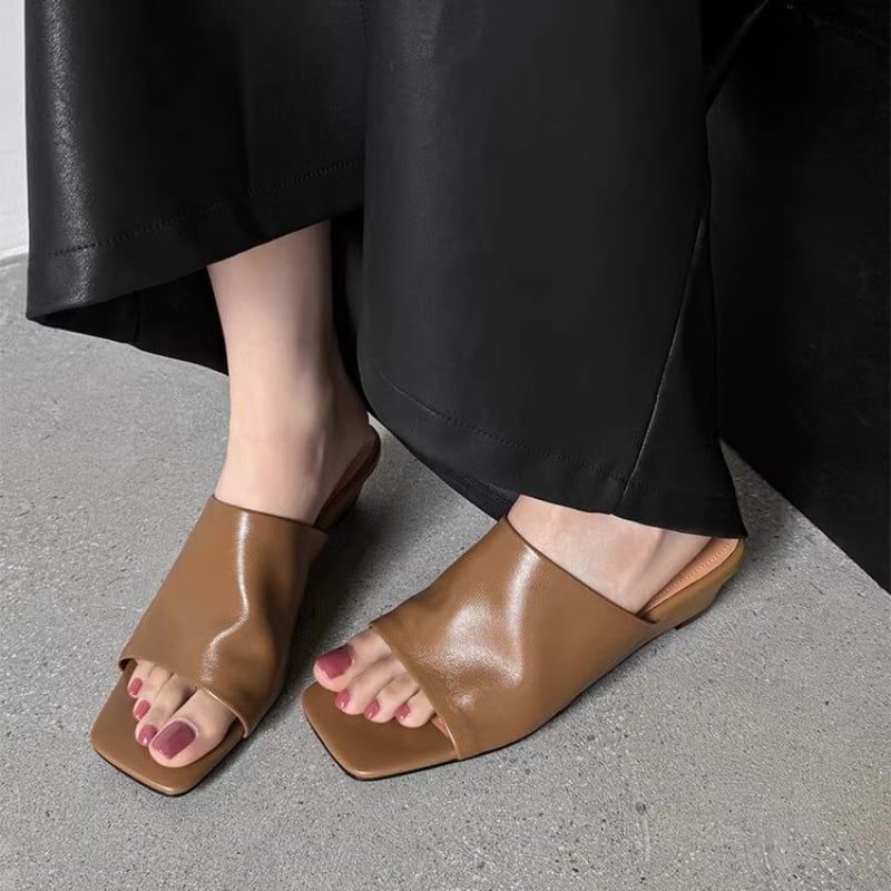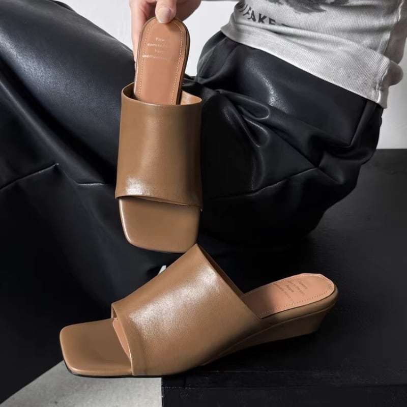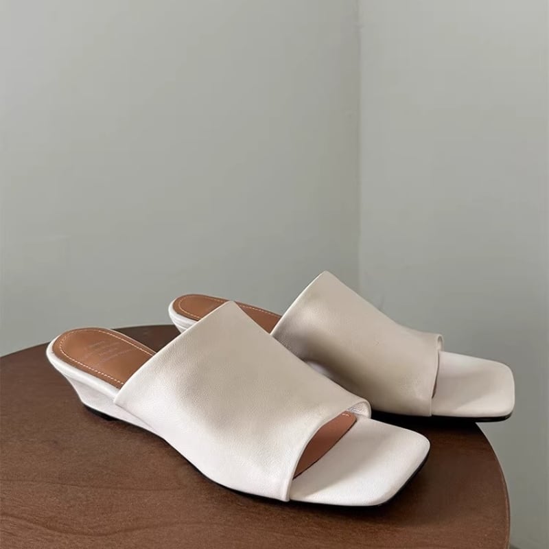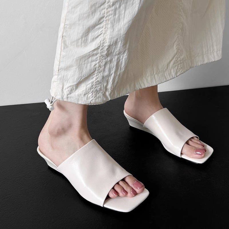 トレンドのスクエアトゥとウェッジソールが上品なミュールサンダル。