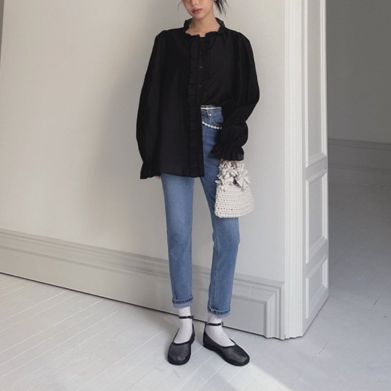 フリルスタンドカラーとトランペットスリーブが可愛いブラウス。