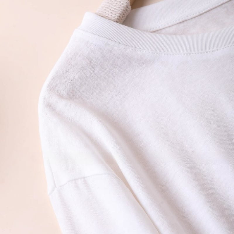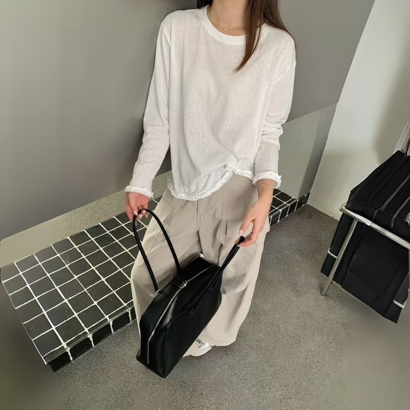 袖口と裾にあしらわれたフリルが、シンプルなロングスリーブTシャツに可愛らしさと女性らしさをプラス。