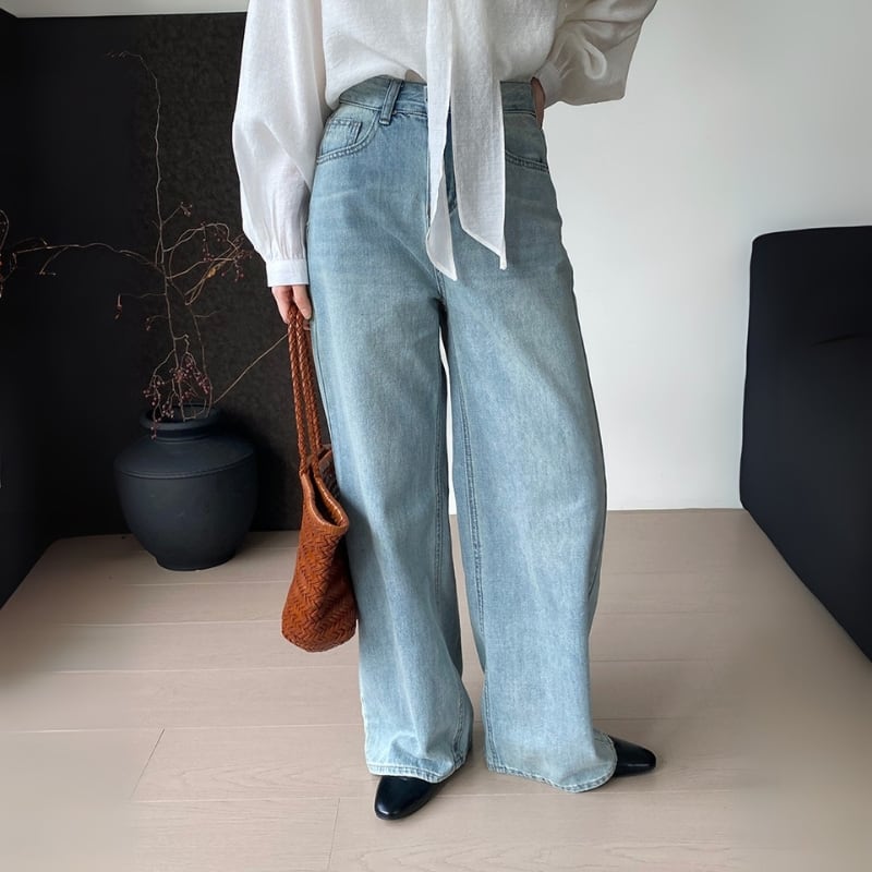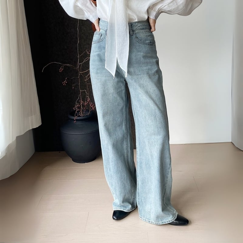 ハイウエストデザインでスタイルアップ効果抜群のワイドレッグデニムパンツ。