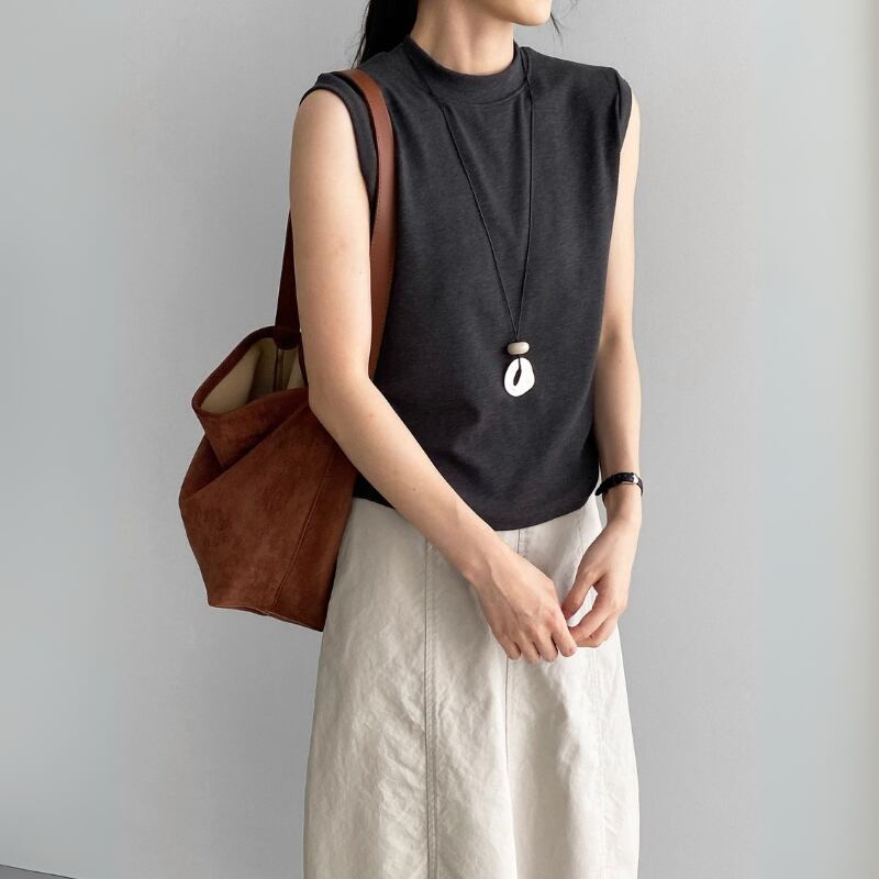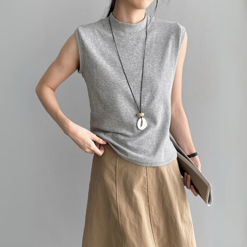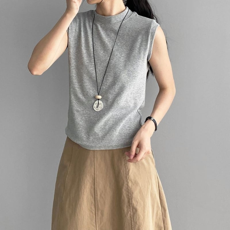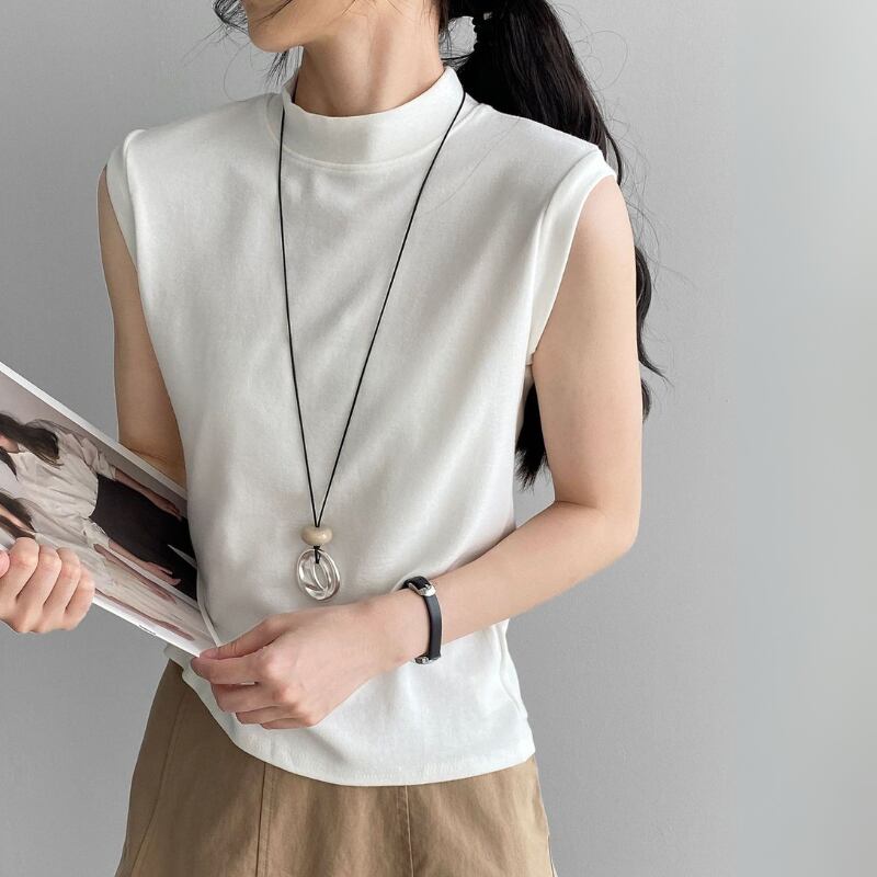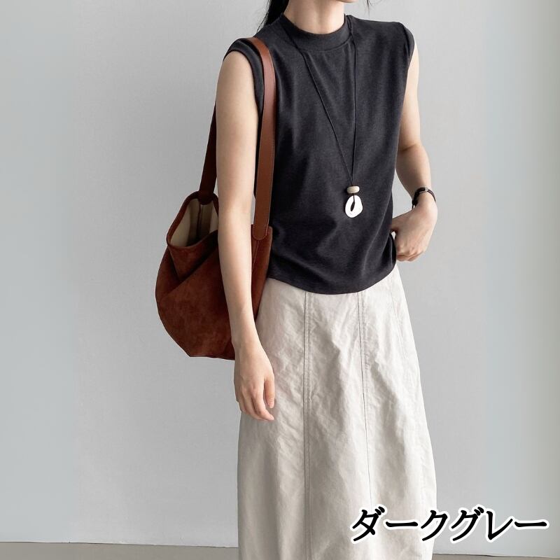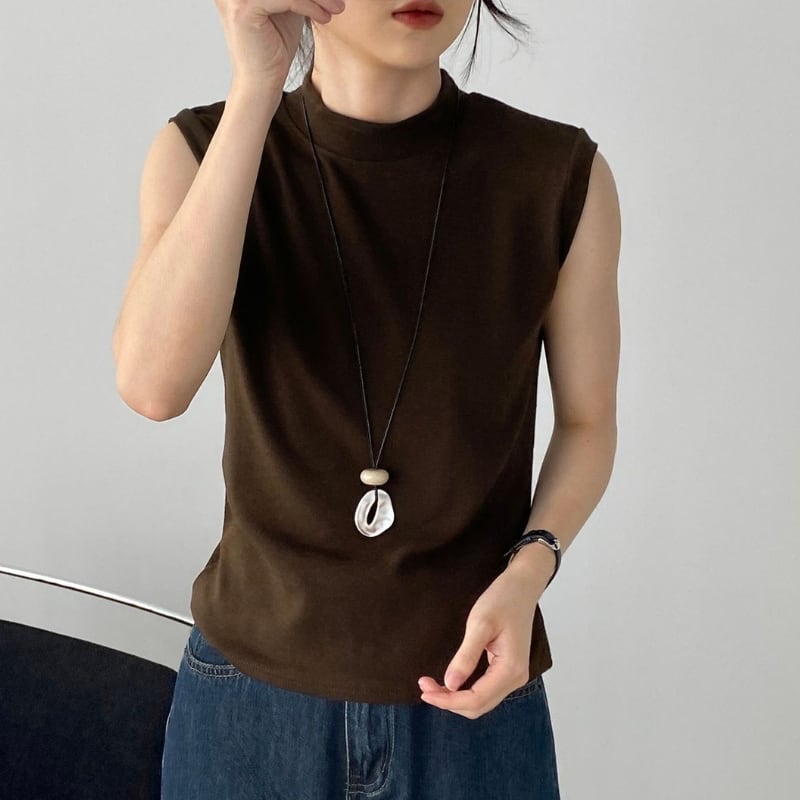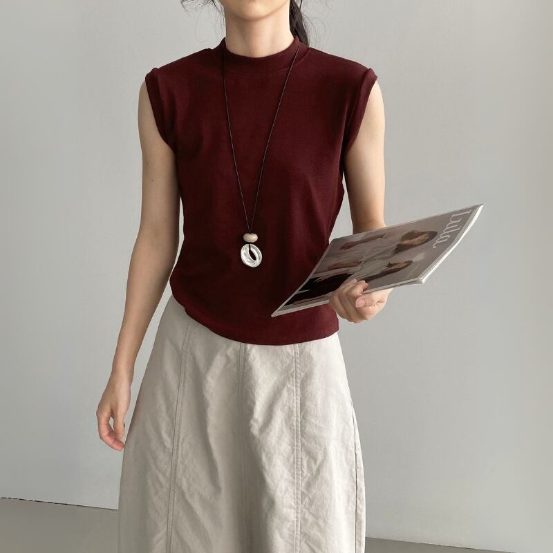 すっきりとした首元のハーフタートルネックのノースリーブトップス。