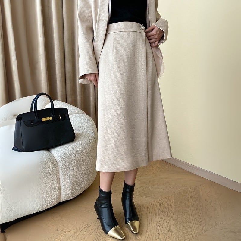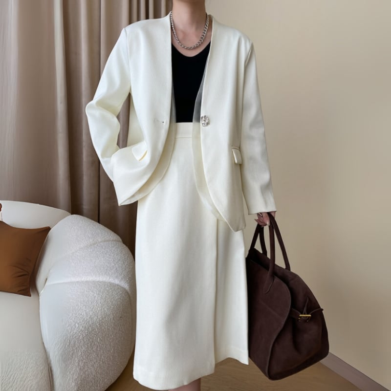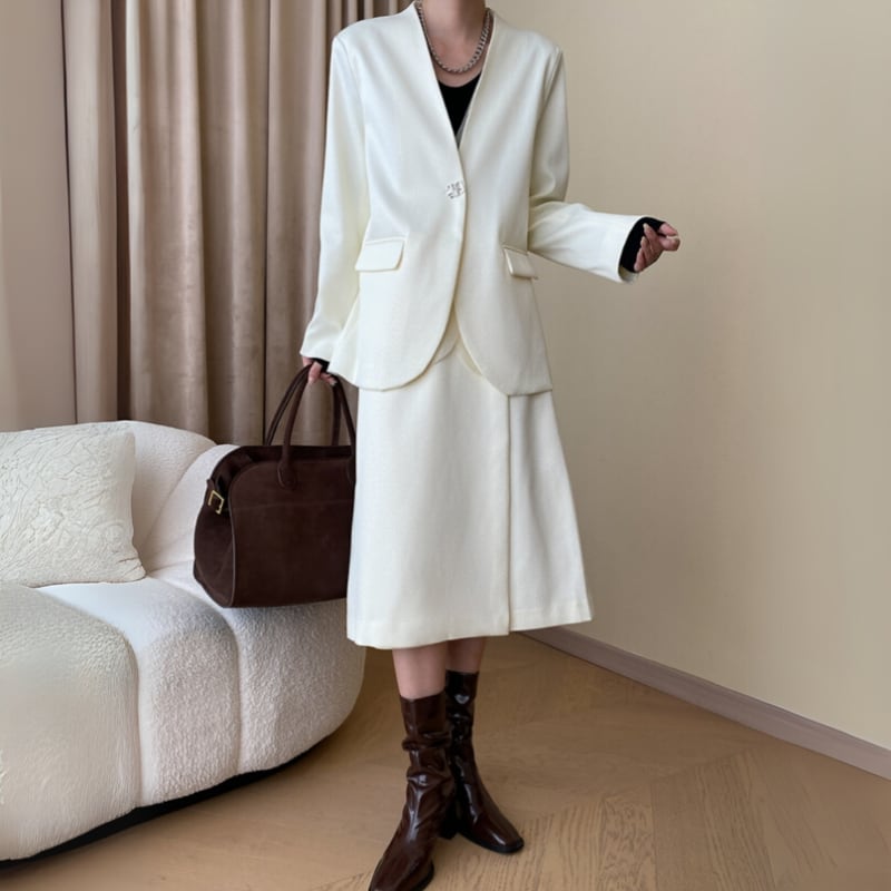 ノーカラージャケットとラップ風Aラインスカートのスーツセットアップ。