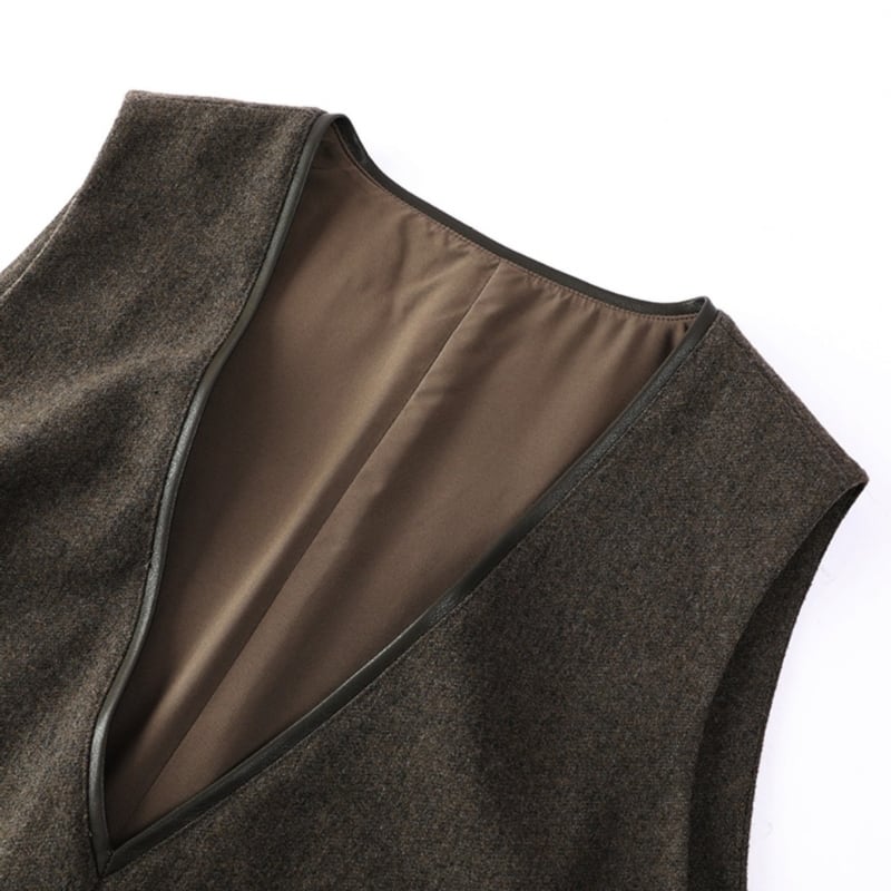 深めのVネックがシャープな印象を与えるノースリーブワンピース。