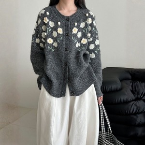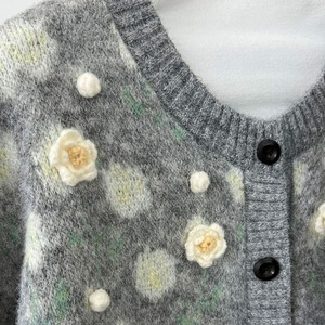 立体的なフラワーモチーフが目を引くニットカーディガン。