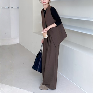 上品な印象のノースリーブベストとワイドパンツのセットアップ。