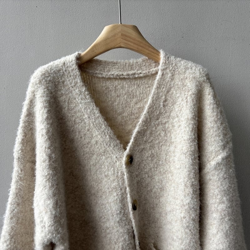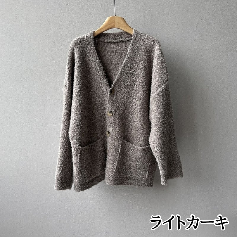 シンプルなデザインで着回し力抜群のニットカーディガン。