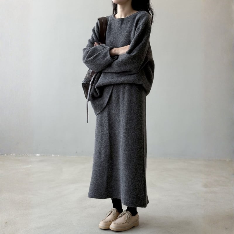 バックボタンがアクセントになったニットセーターとミディ丈スカートのセットアップ。