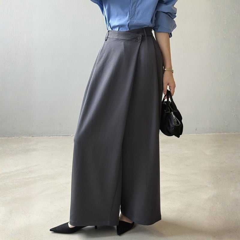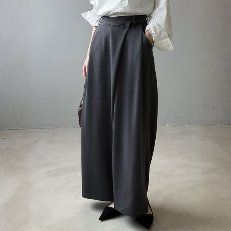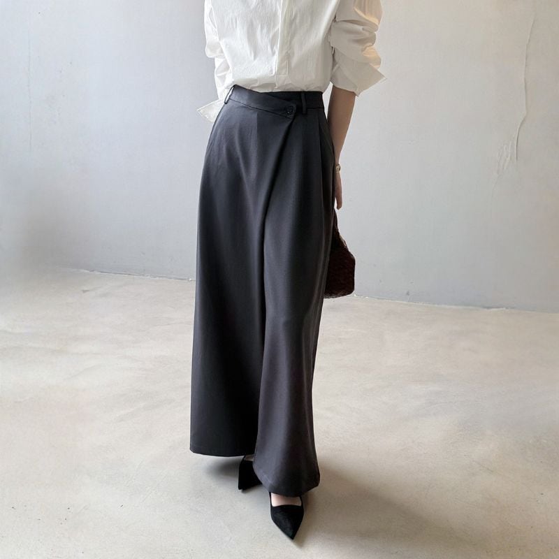 アシンメトリーなラップデザインが特徴的なワイドスーツパンツ。