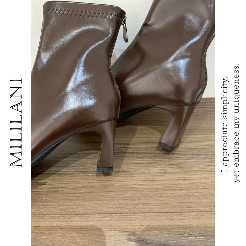 足元をすっきりと見せてくれるポインテッドトゥのショートブーツ。