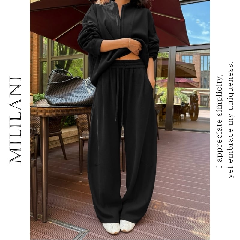 ゆったりとしたシルエットで、大人の余裕を感じさせるプルオーバーとパンツのセットアップ。