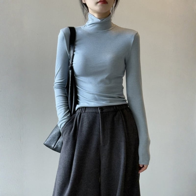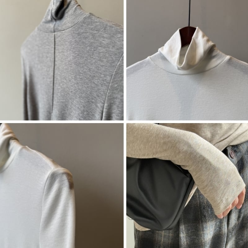 スリムなシルエットで、ジャケットやカーディガンのインナーとしても着ぶくれせず、すっきりと着こなせます。