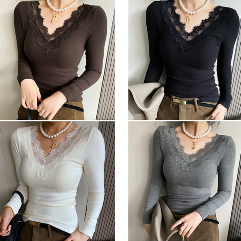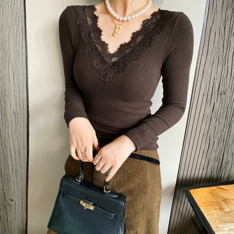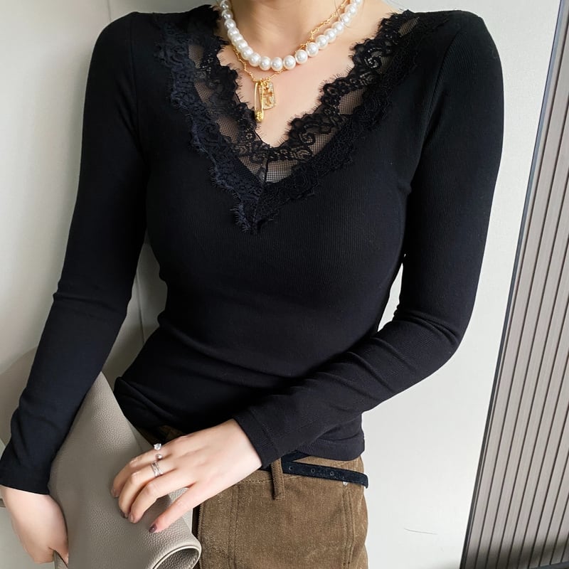 レース Vネック 長袖 スリムフィット カットソー ◆4color 204509