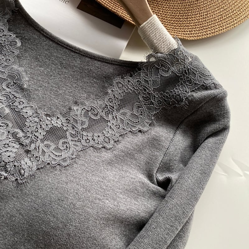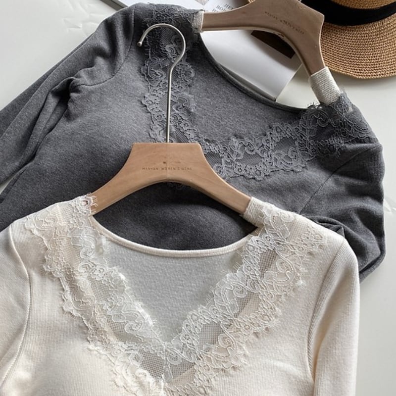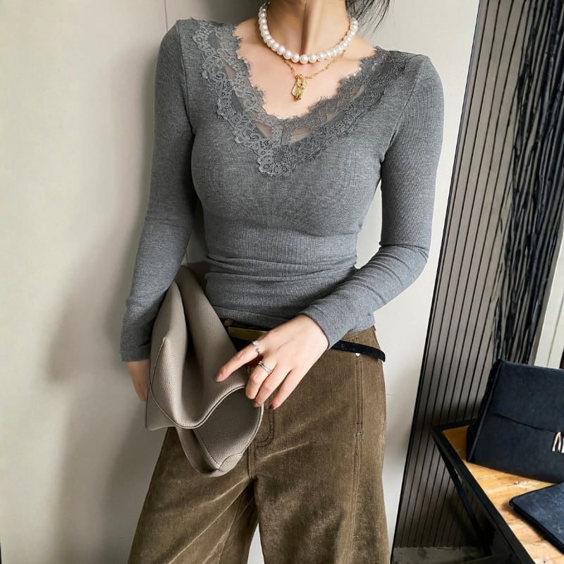 Vネックのレースが女性らしさを引き立てる長袖カットソー。