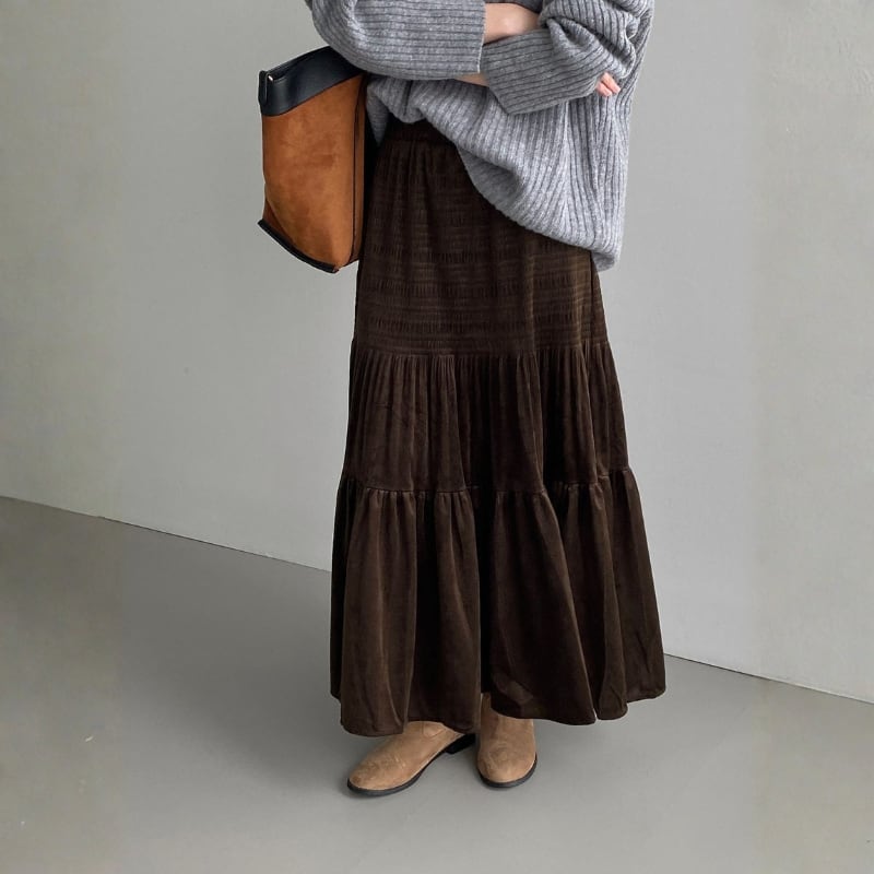 ほどよいボリューム感が魅力のティアードロングスカート。