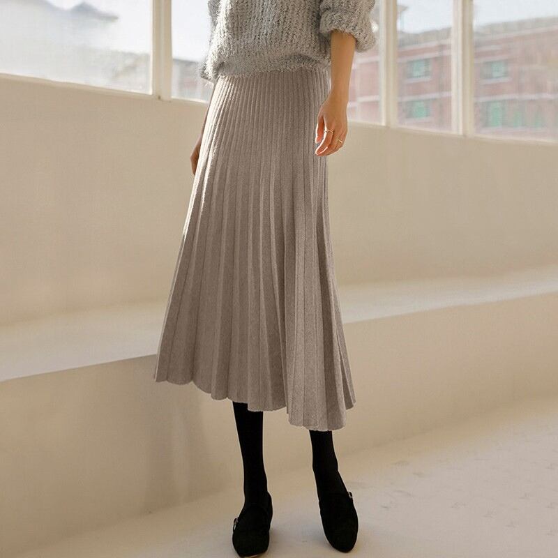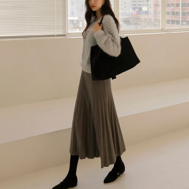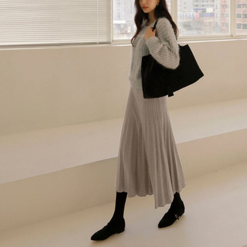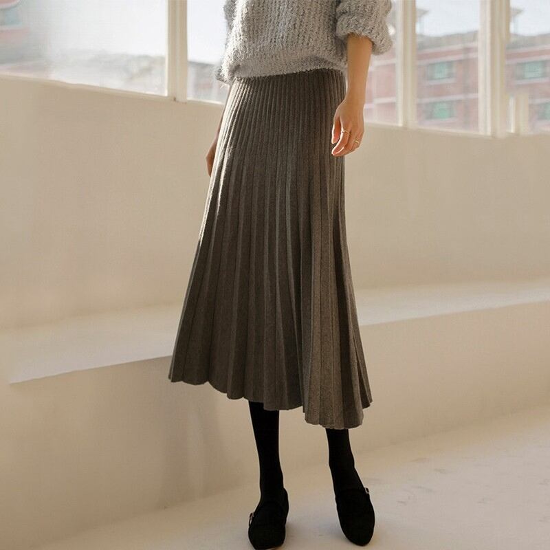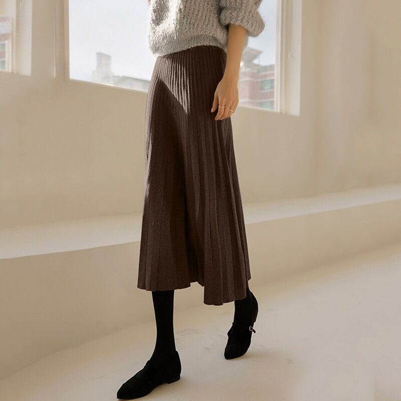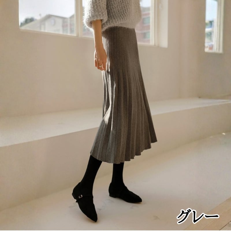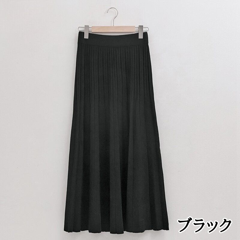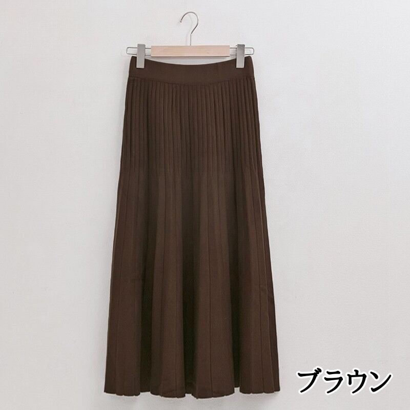 ダブルプリーツ ミモレ丈 Aライン ニットスカート ◆5color 204544