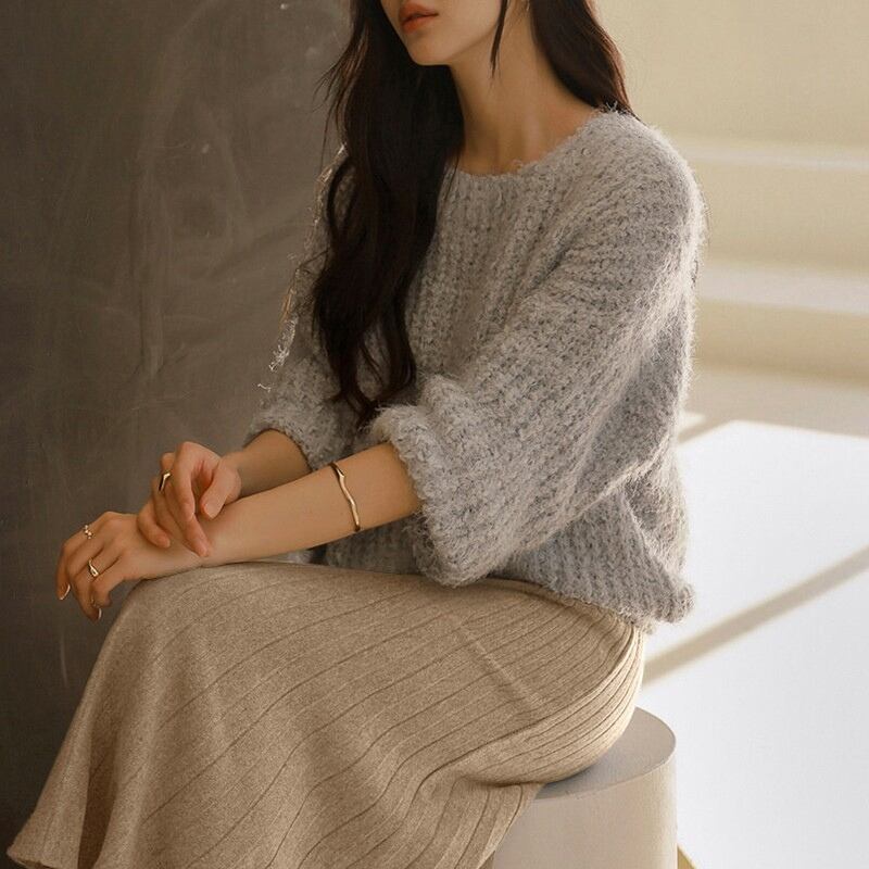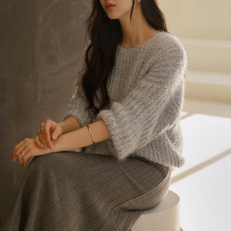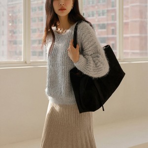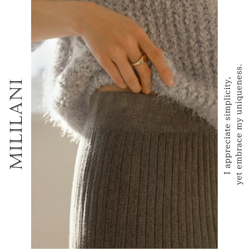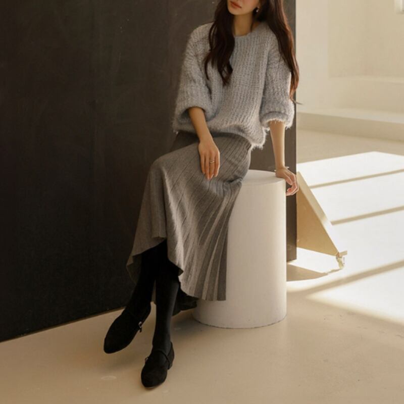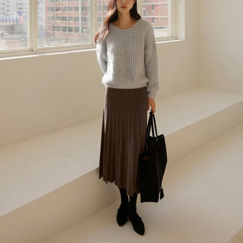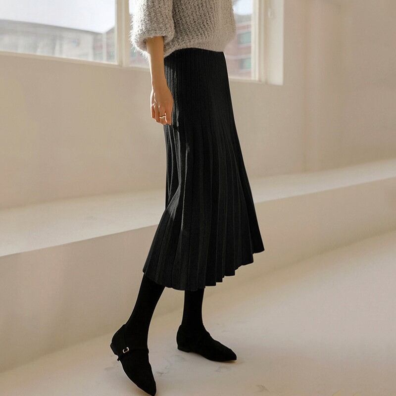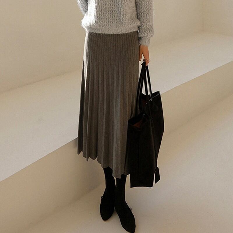 ダブルプリーツ ミモレ丈 Aライン ニットスカート ◆5color 204544