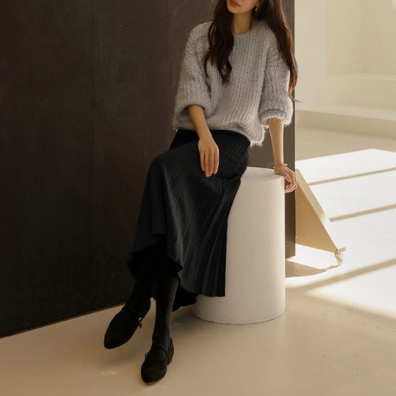 歩くたびに優雅に揺れる、ダブルプリーツのAラインニットスカート。