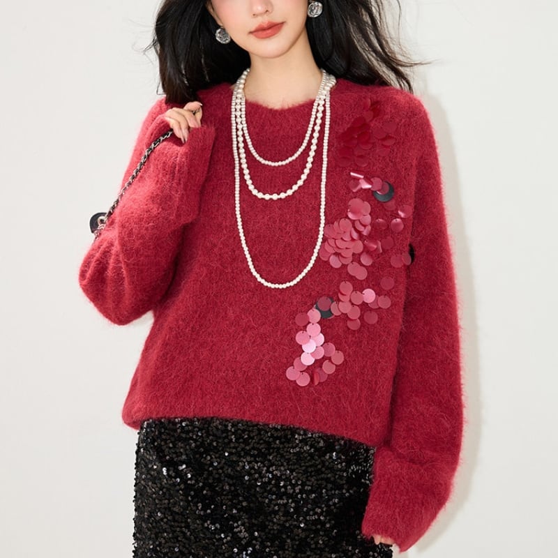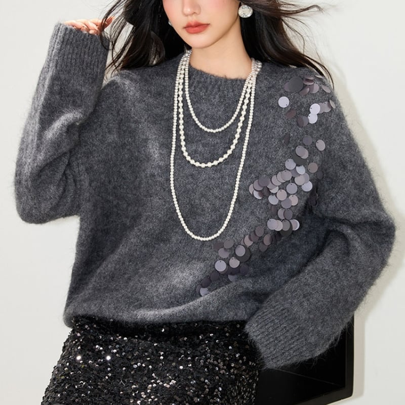 スパンコール装飾 クルーネック 長袖 ニット ◆2color 204556