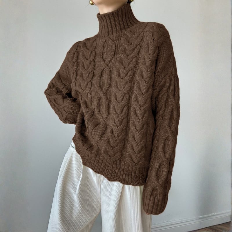 立体感のあるケーブル編みが、シンプルながらも表情豊かな印象を与えます。