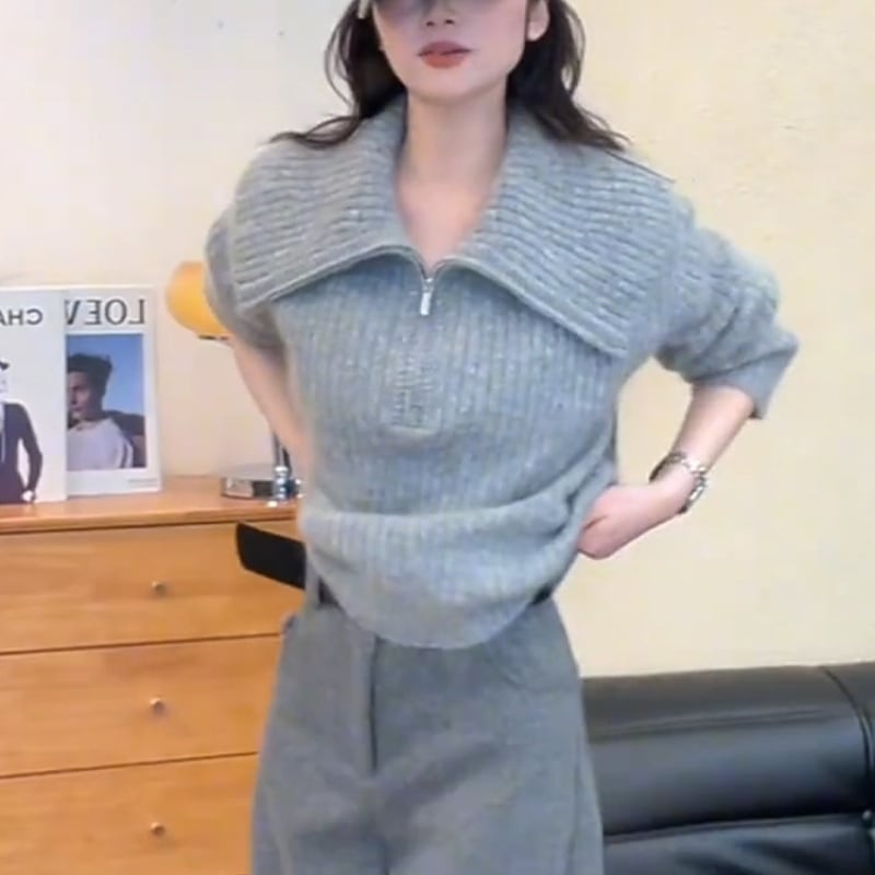 ハーフジップデザインがポイントのニットトップス。