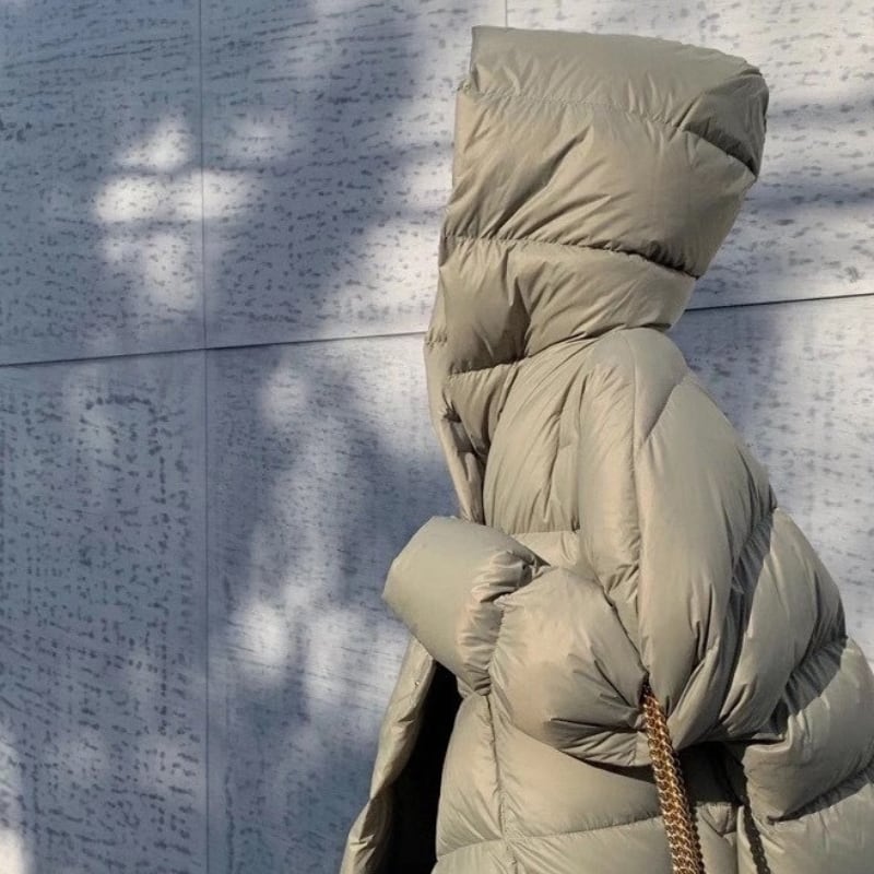 首元にボリュームを持たせたクロスネックデザインが目を引くダウンジャケット。
