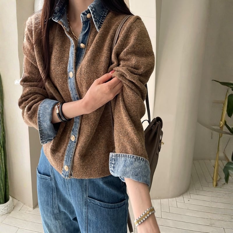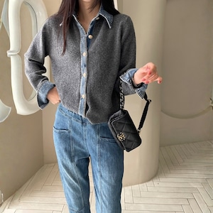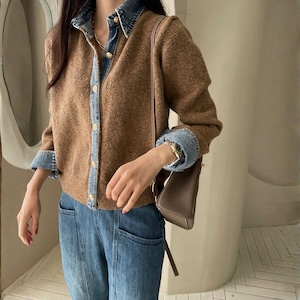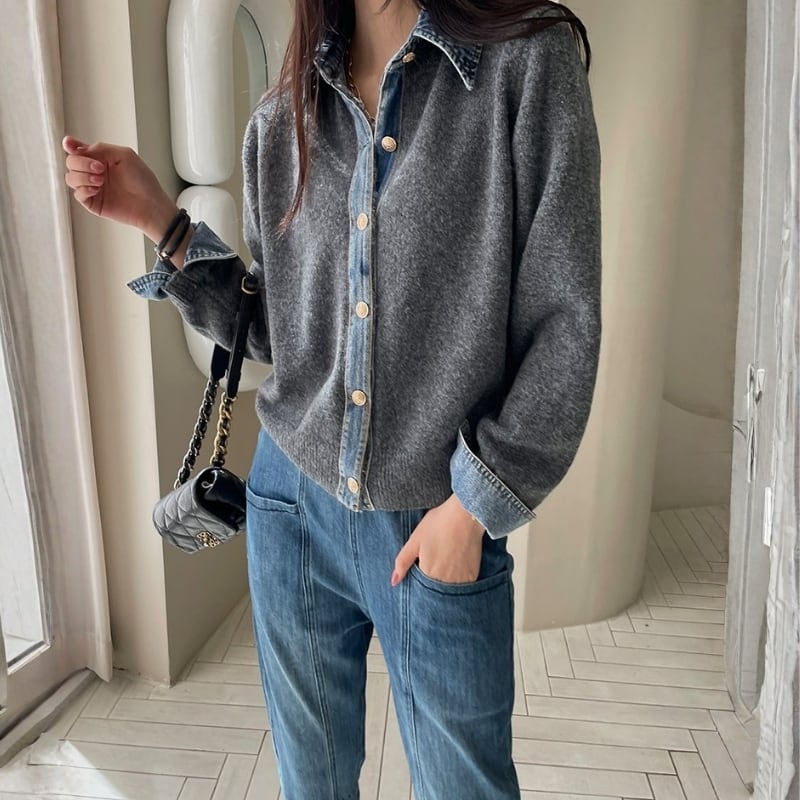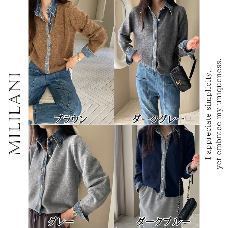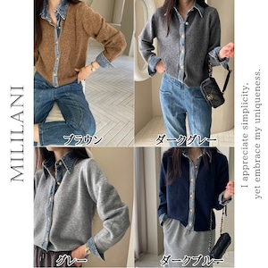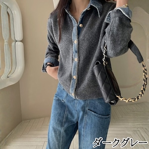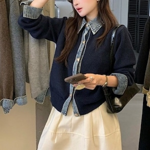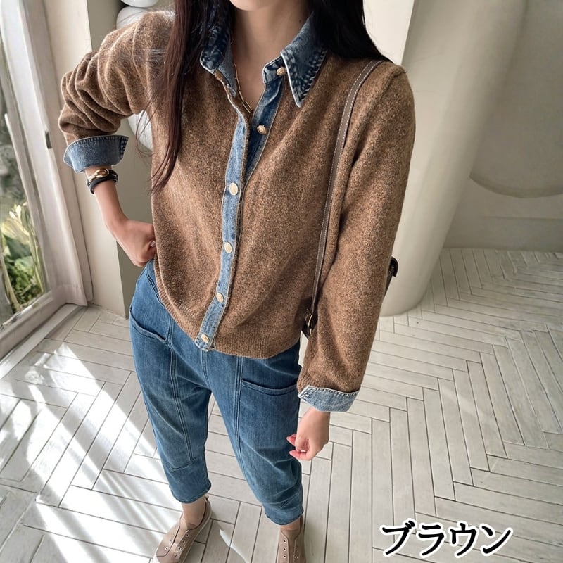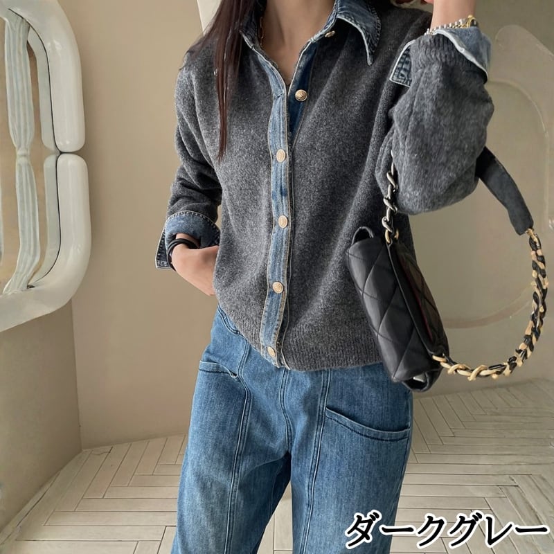 デニム切替 シャツカラー ニットカーディガン ◆4color 204568