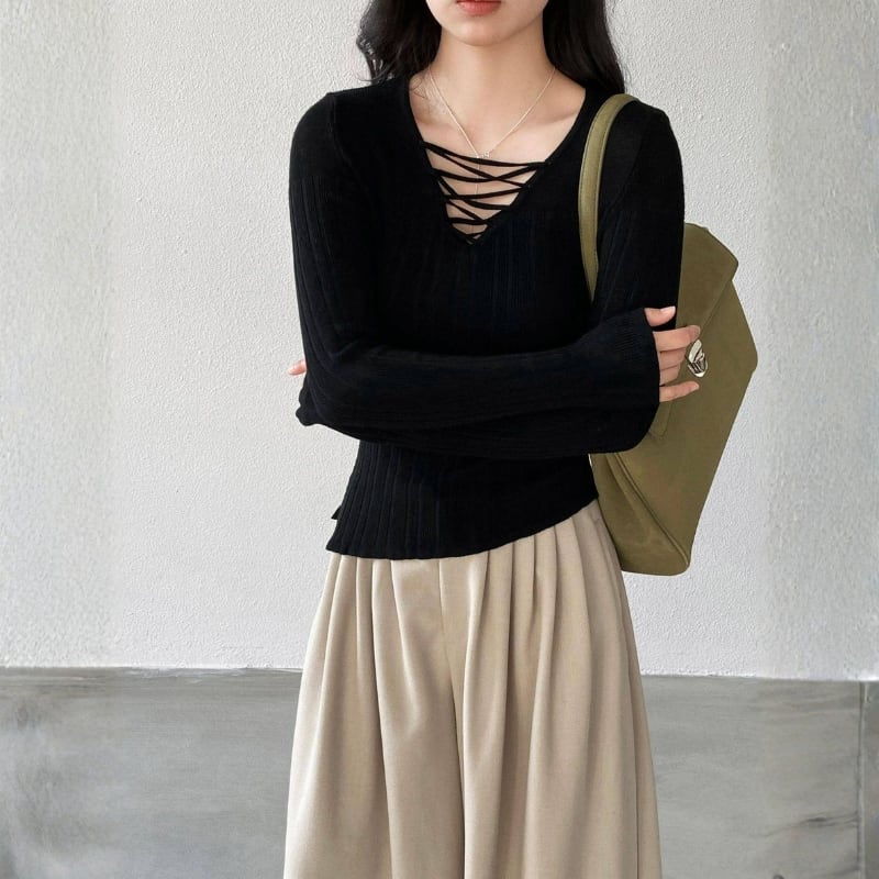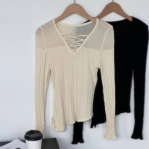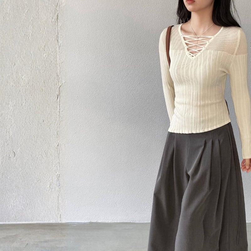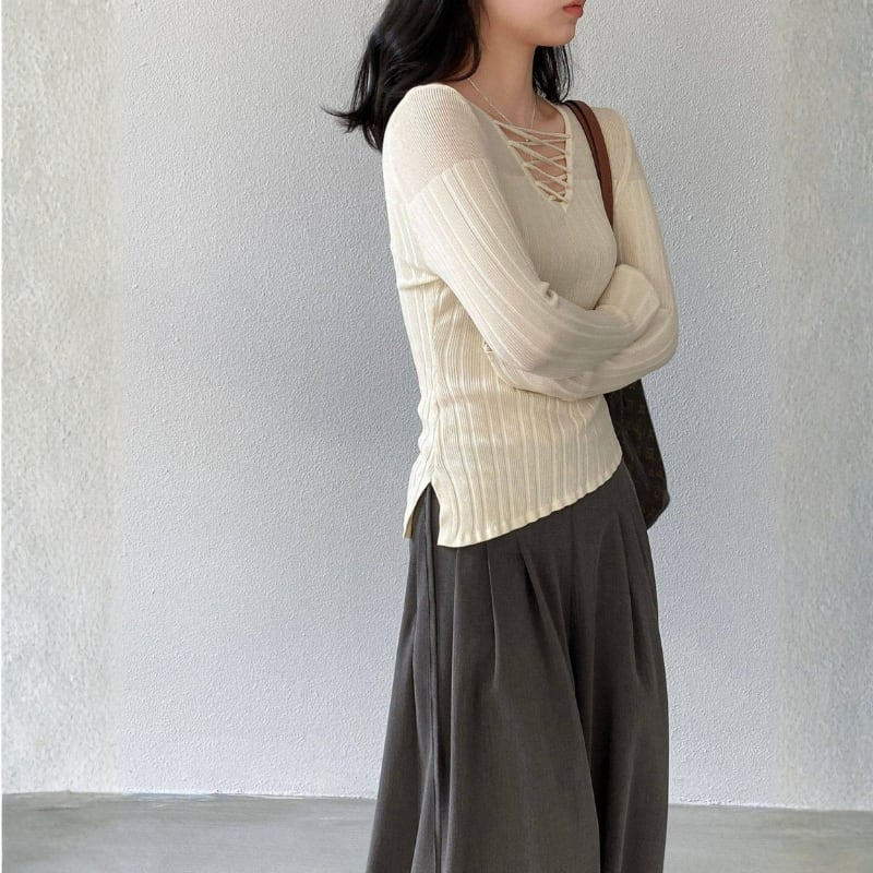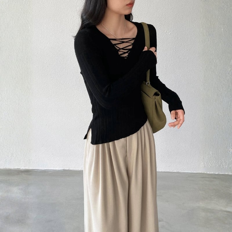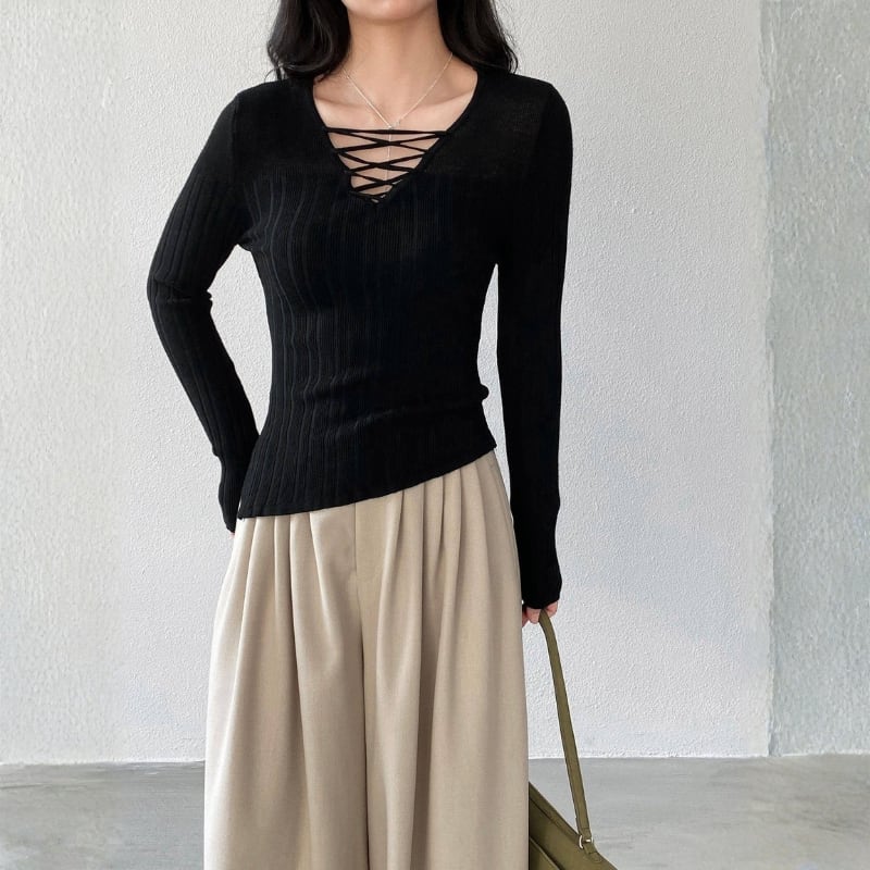レースアップ スリムフィット 長袖ニット ◆2color 204575