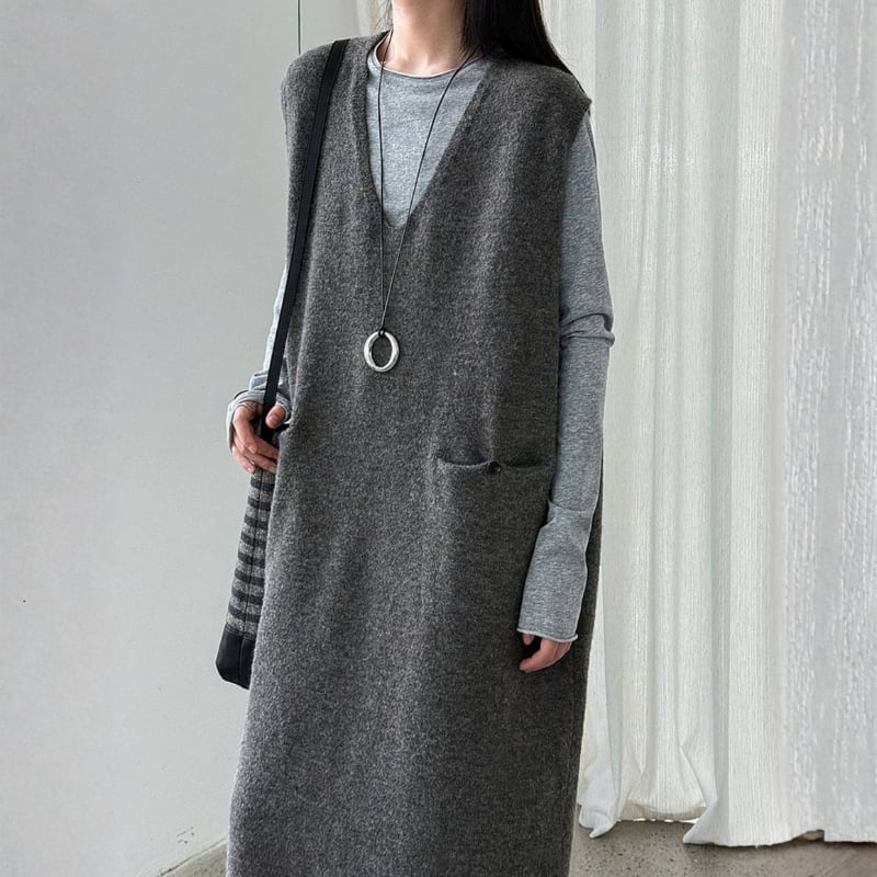 Vネック フロントポケット ノースリーブ ワンピース ◆3color 204579