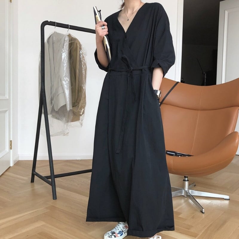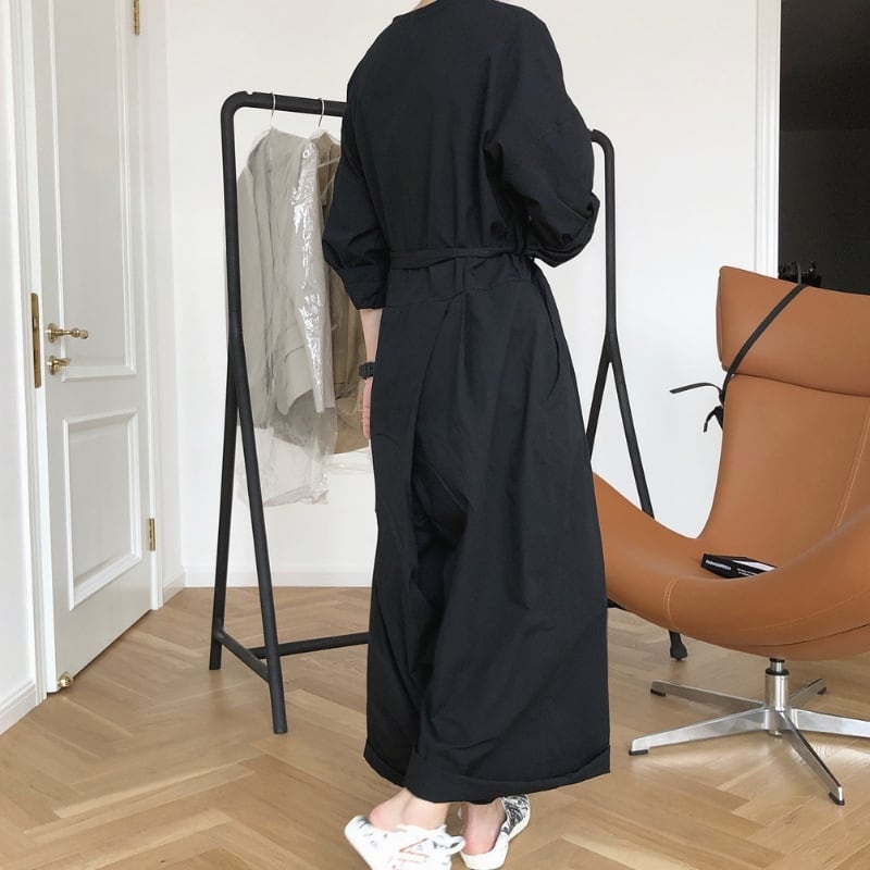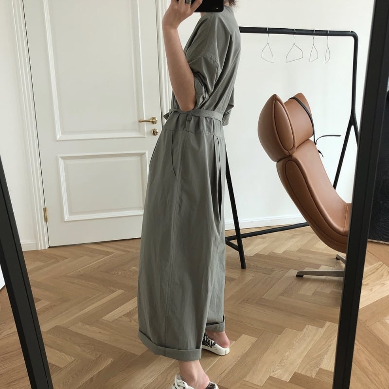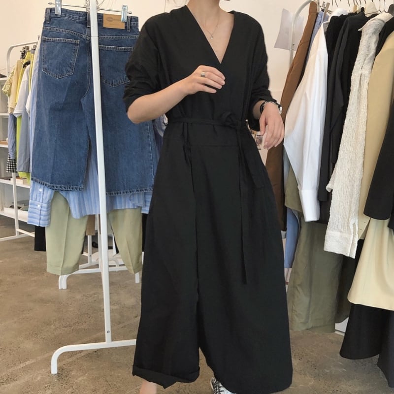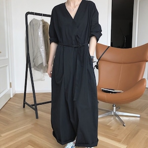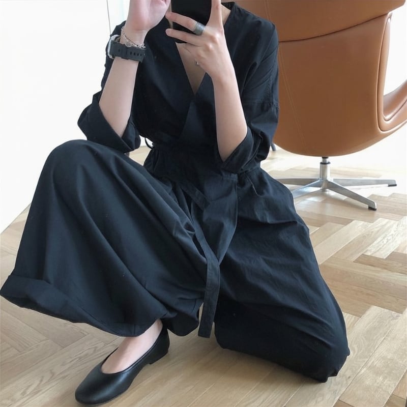 Vネック ベルト紐付き ワイドレッグ ジャンプスーツ ◆2color 204617