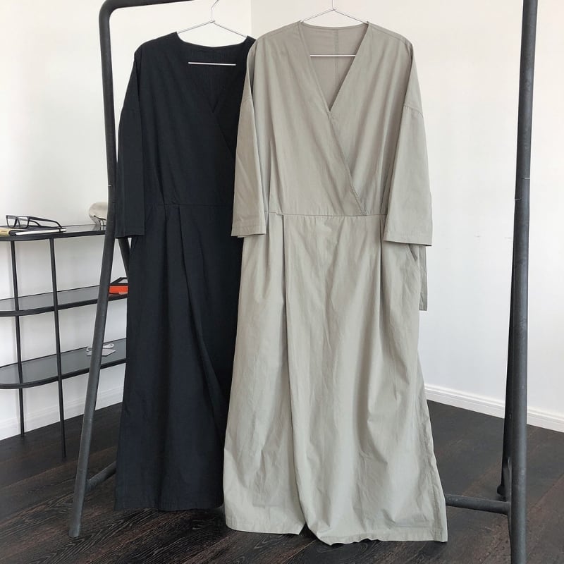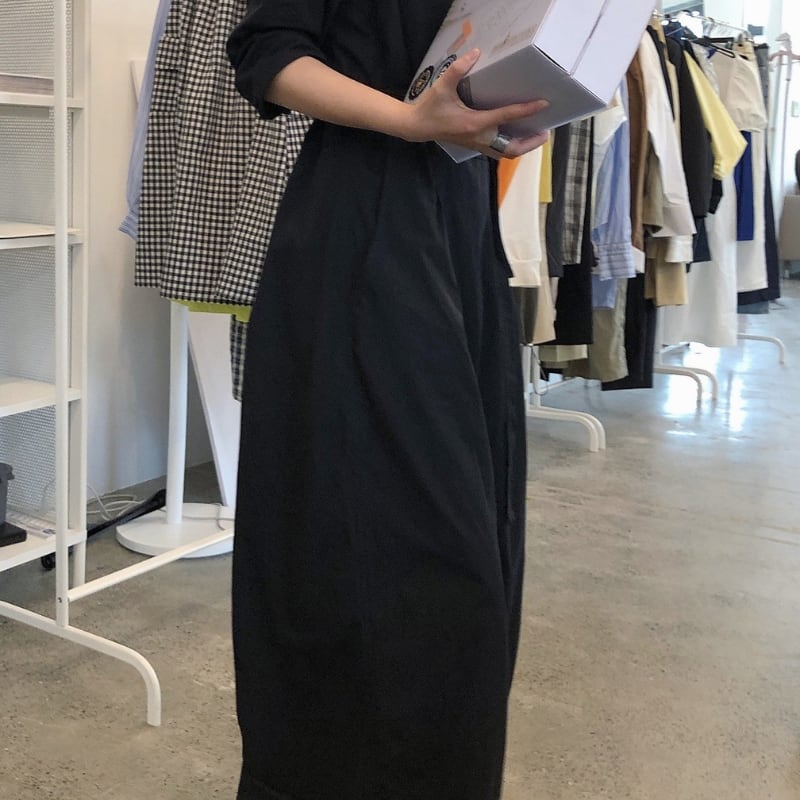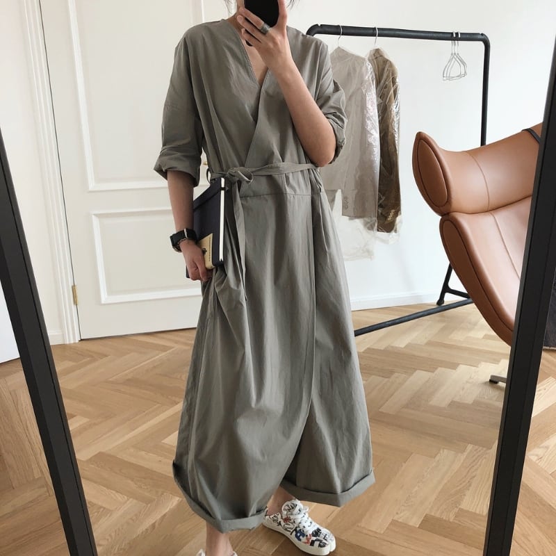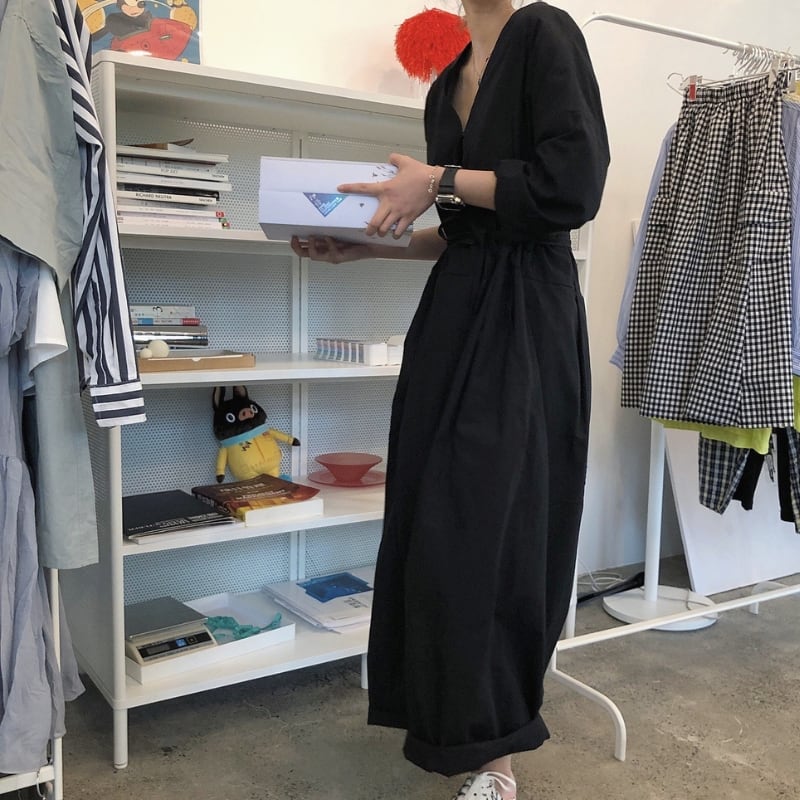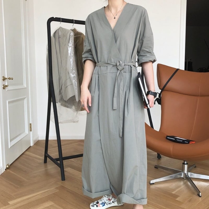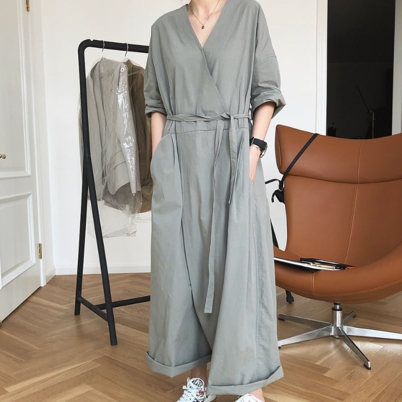 Vネック ベルト紐付き ワイドレッグ ジャンプスーツ ◆2color 204617
