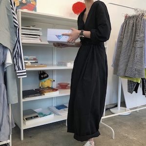 Vネックがデコルテを綺麗に見せてくれるジャンプスーツ。