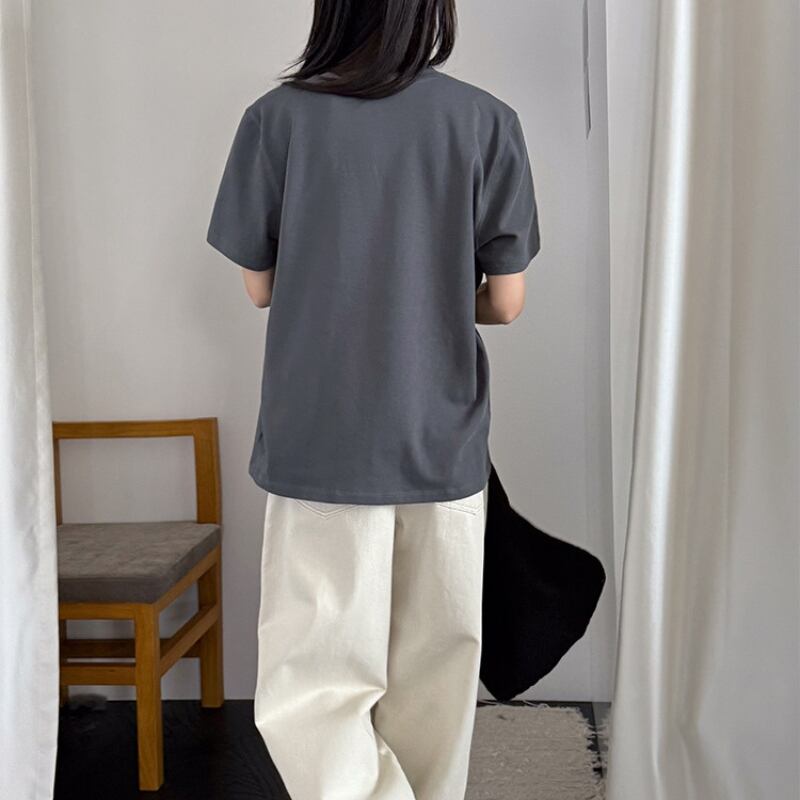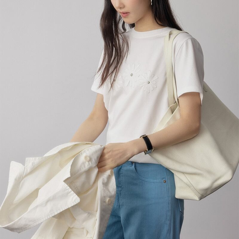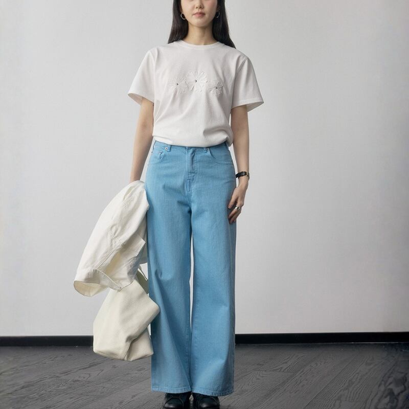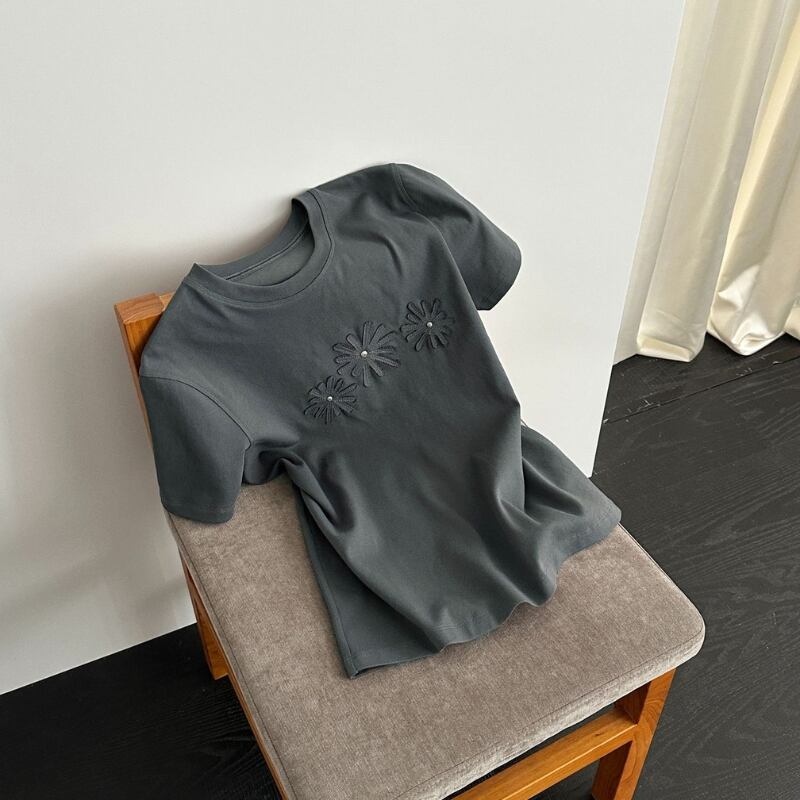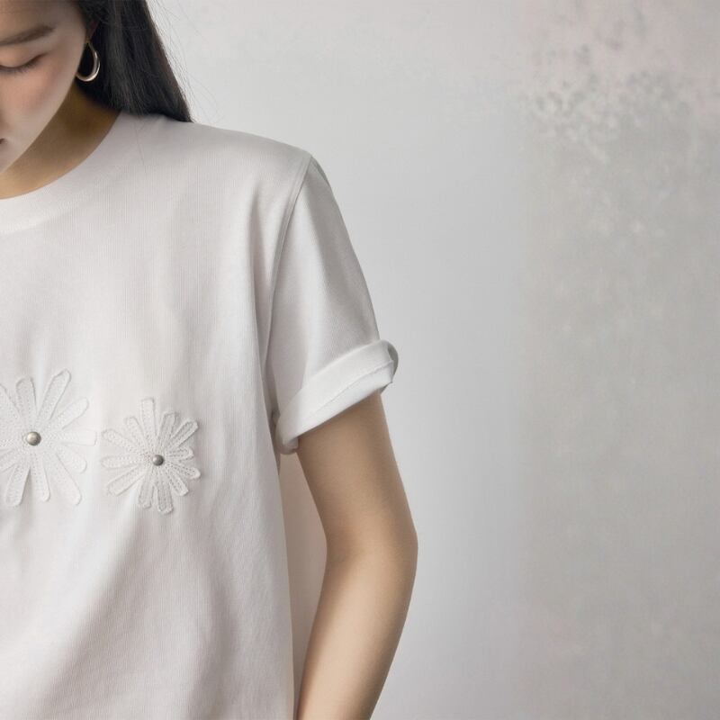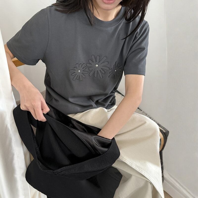 胸元のフラワーモチーフ刺繍が目を引く半袖Tシャツ。