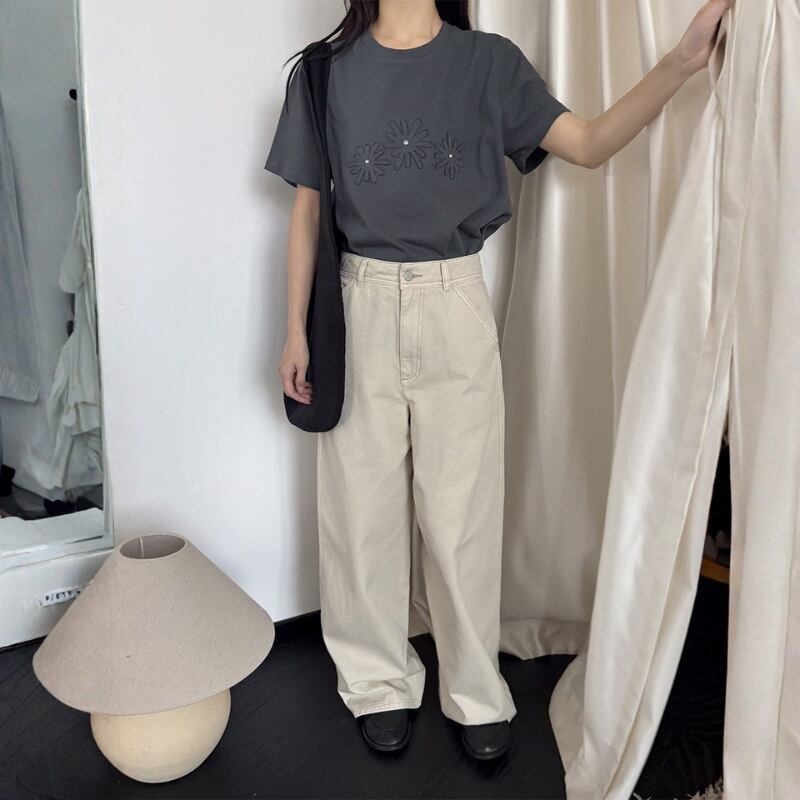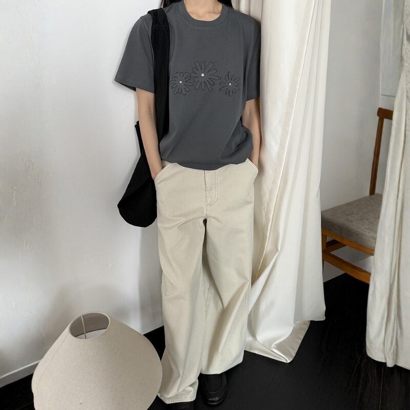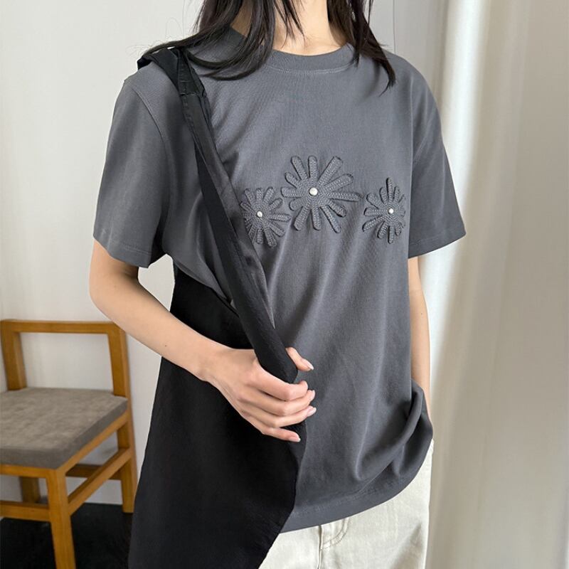 フラワーモチーフ 半袖 クルーネック Tシャツ ◆2color 204619