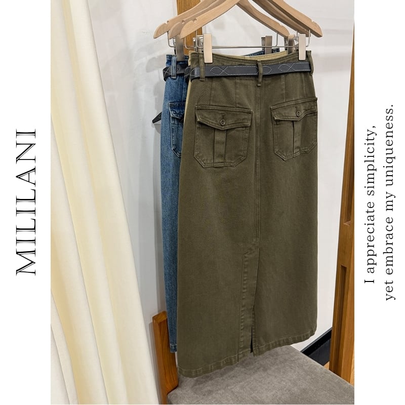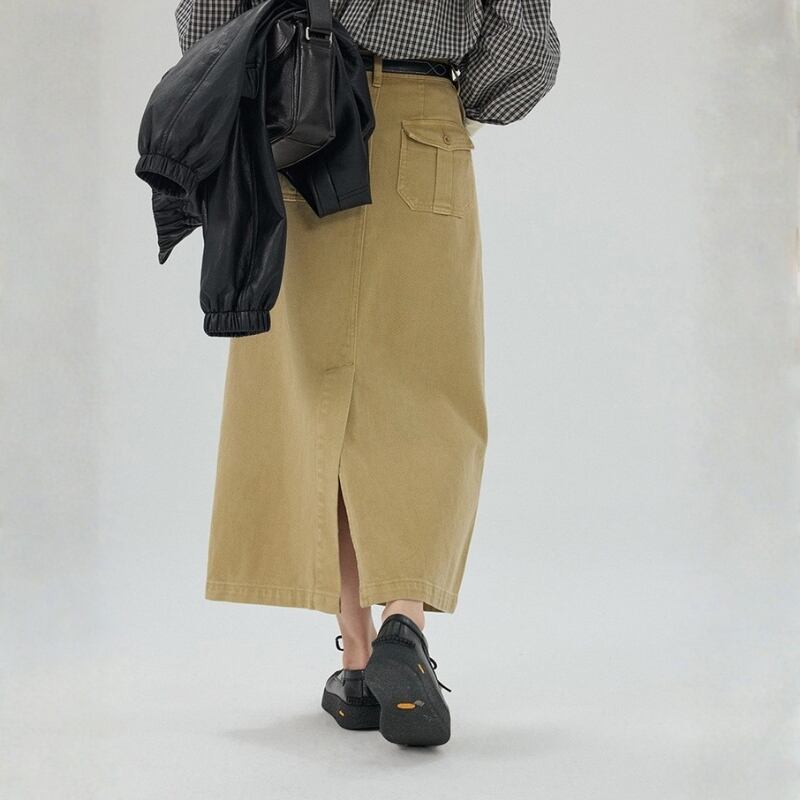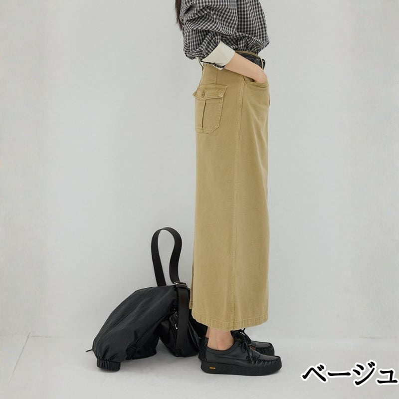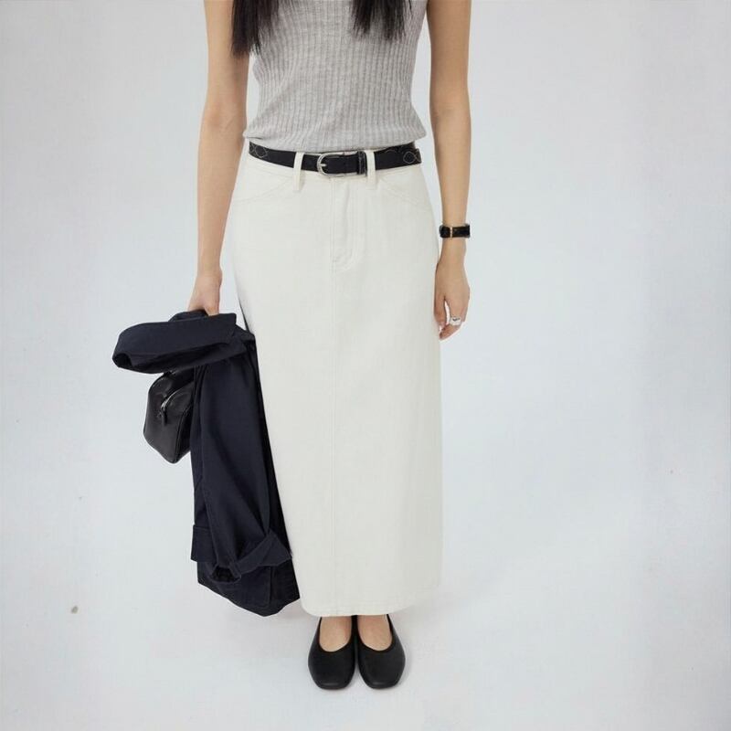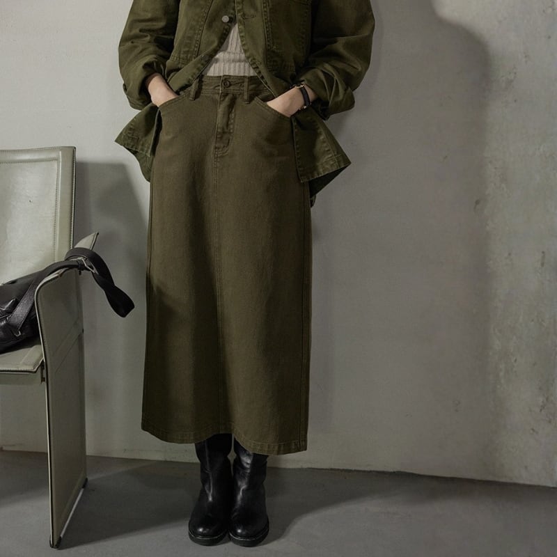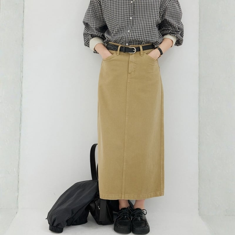 スタイルアップ効果が期待できるハイウエストマキシ丈スカート。
