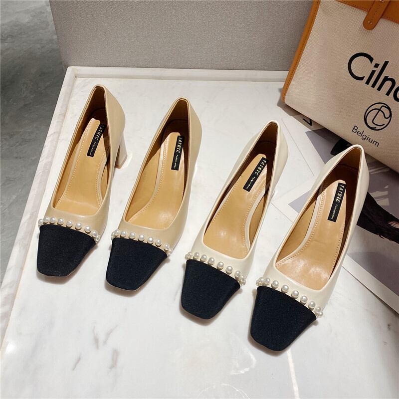 パール付きバイカラーチャンキーヒールパンプス ◆2col 202051