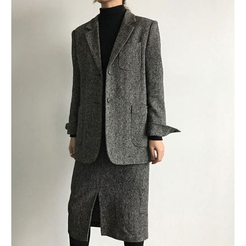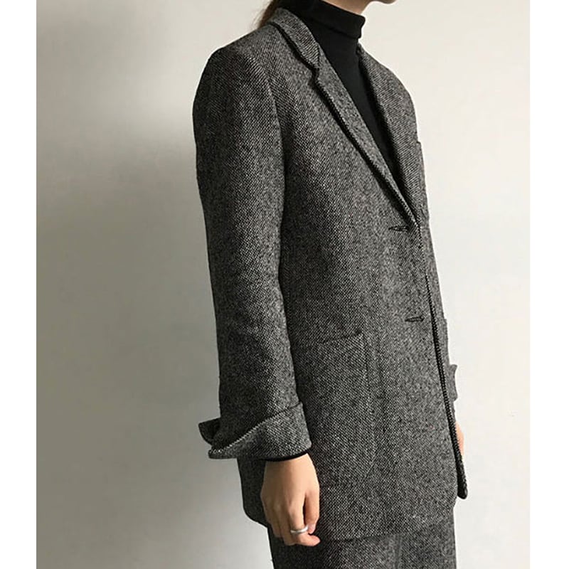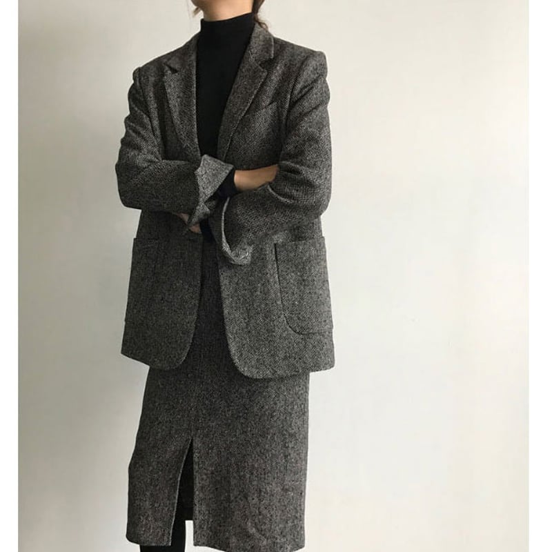 温かみのあるウール素材のセットアップ 細身シルエットの美しいラインで女性らしさを演出。