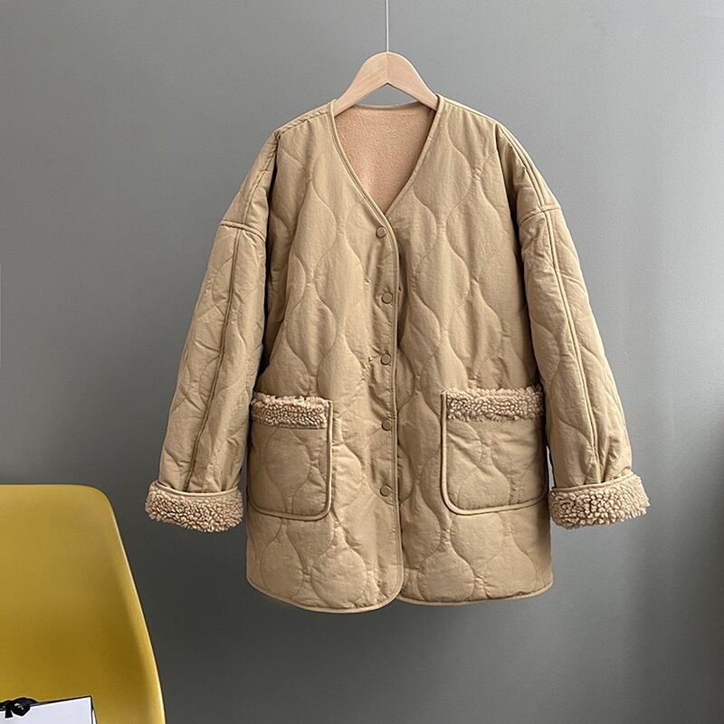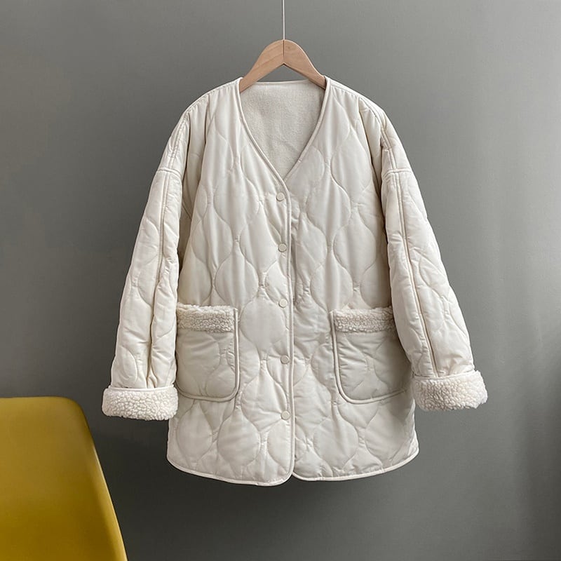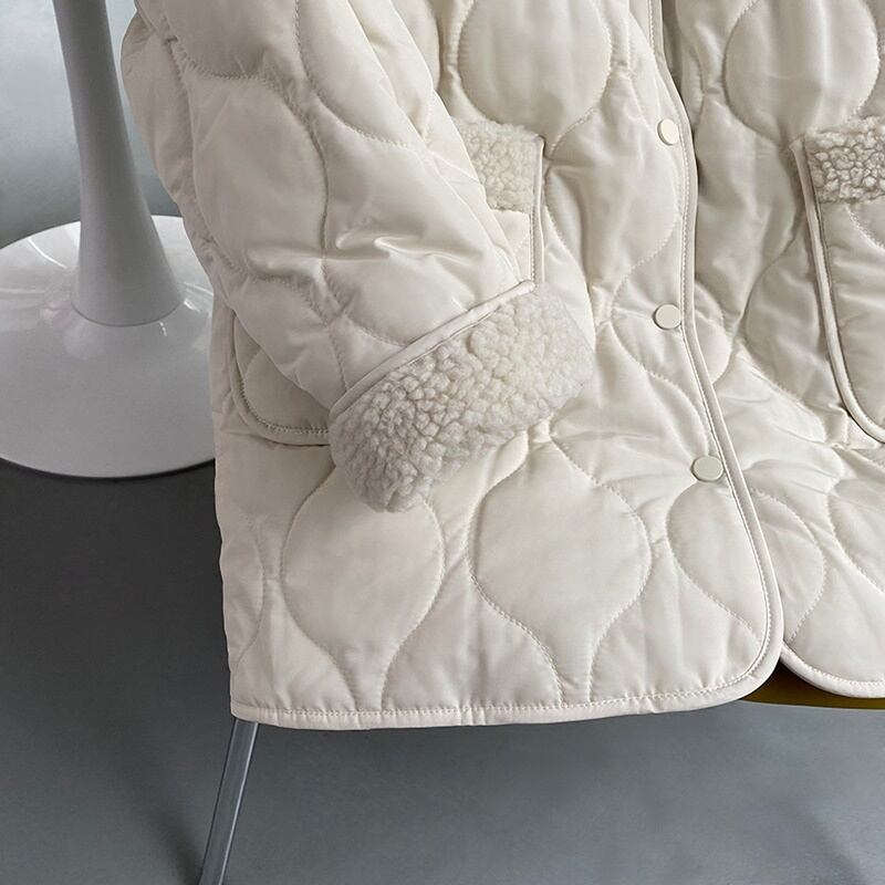 ボア切替で可愛らしく仕上がったキルティングジャケット。