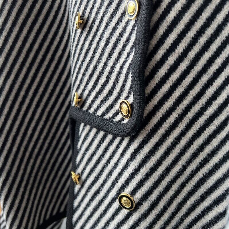 ゴールドボタンとストライプの組み合わせがクラシカルなジャケット。