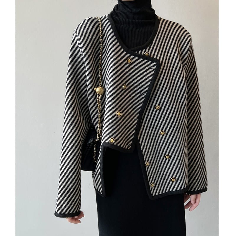 ノーカラーで上品さがありながら変形のダブル仕様でモードにも見せてくれる一着。