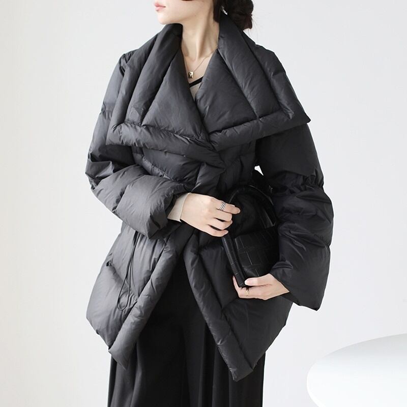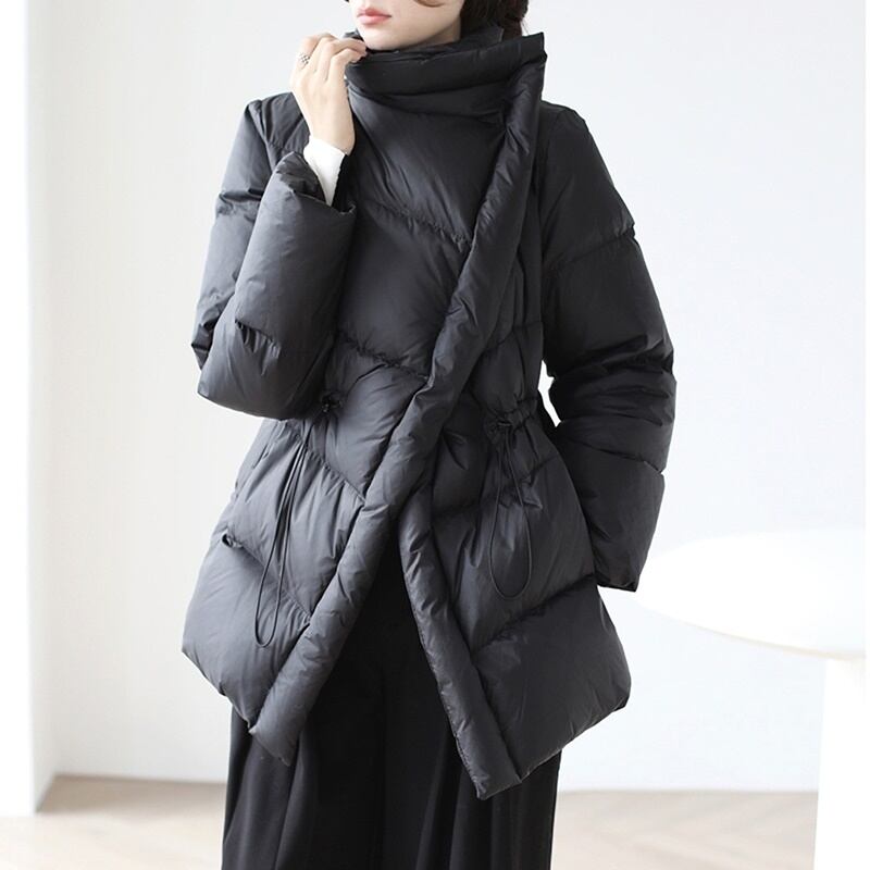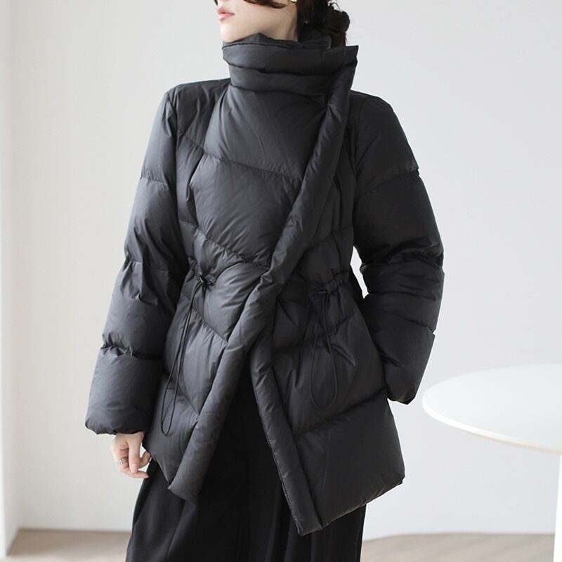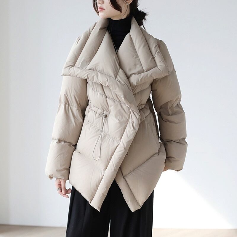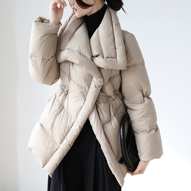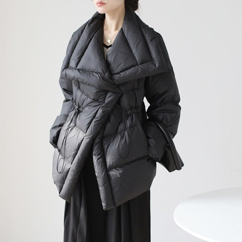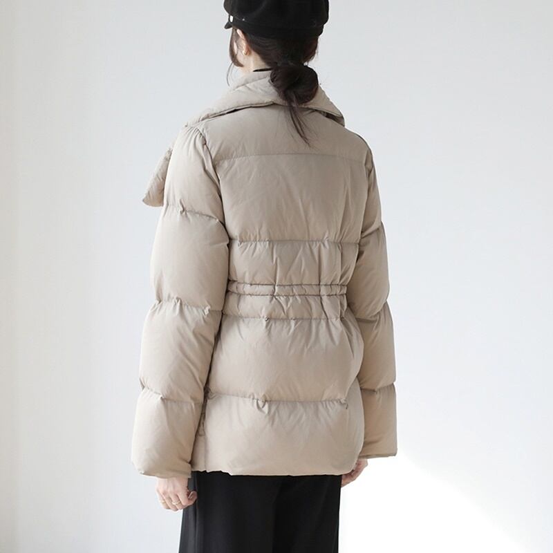 高めの位置にドロストコードを配しダウンでも膨らみすぎずエレガントに仕上がっています。