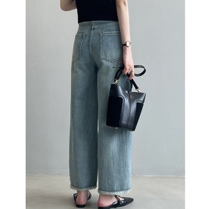 ハイウエスト ワイドレッググ ステッチ入り カットオフ デニムパンツ ◆2col 203817
