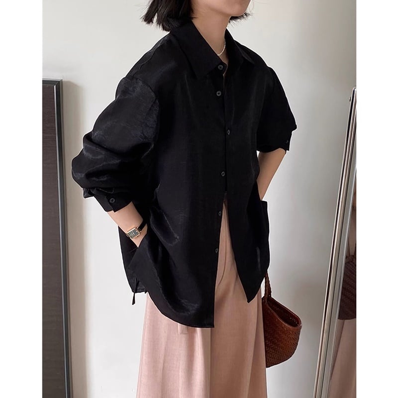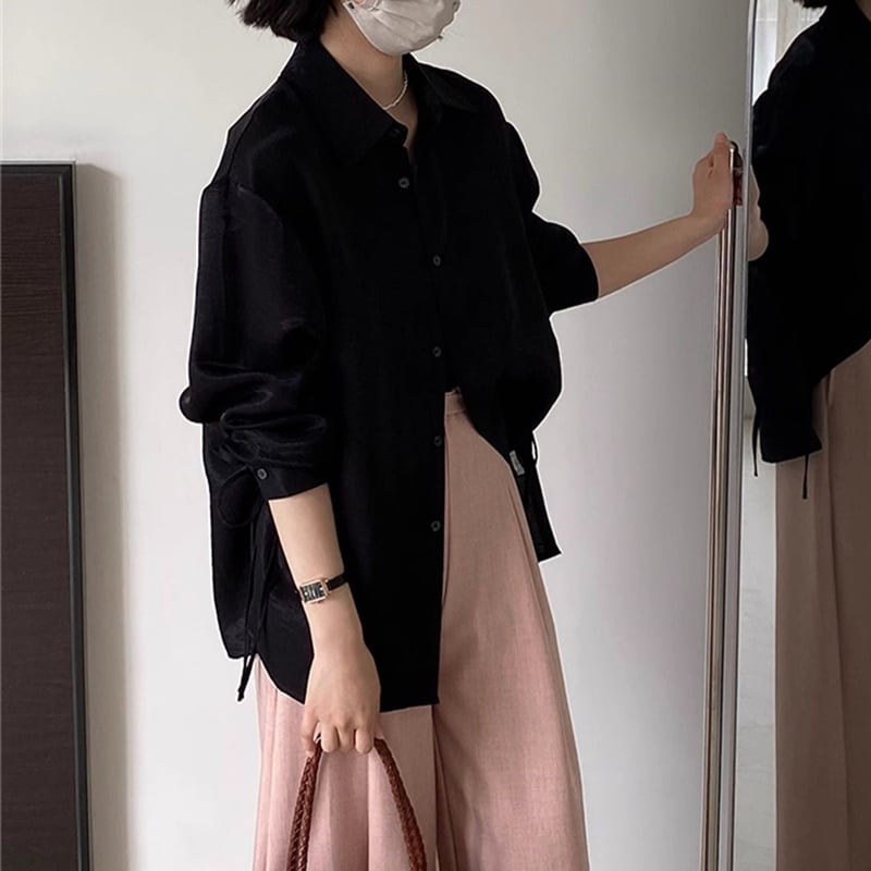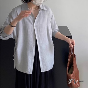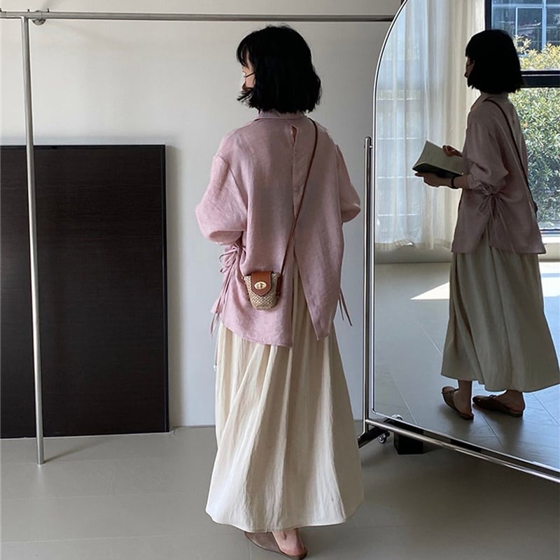 バックデザインと両サイドにドロストのクシュクシュが映えるゆったりとした長袖シャツ。