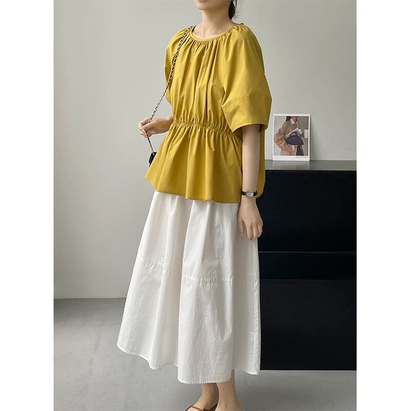 ランタンスリーブ 5分袖 ラウンドネック ブラウス ◆2col 203851