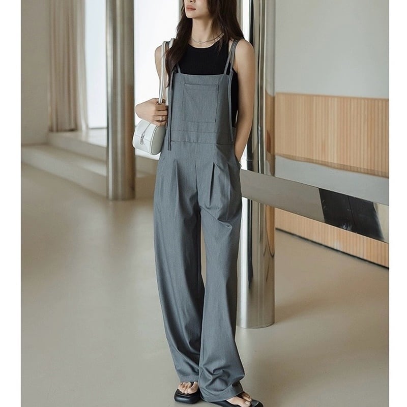 華奢な肩紐とルーズ感たっぷりなワイドパンツサロペット。