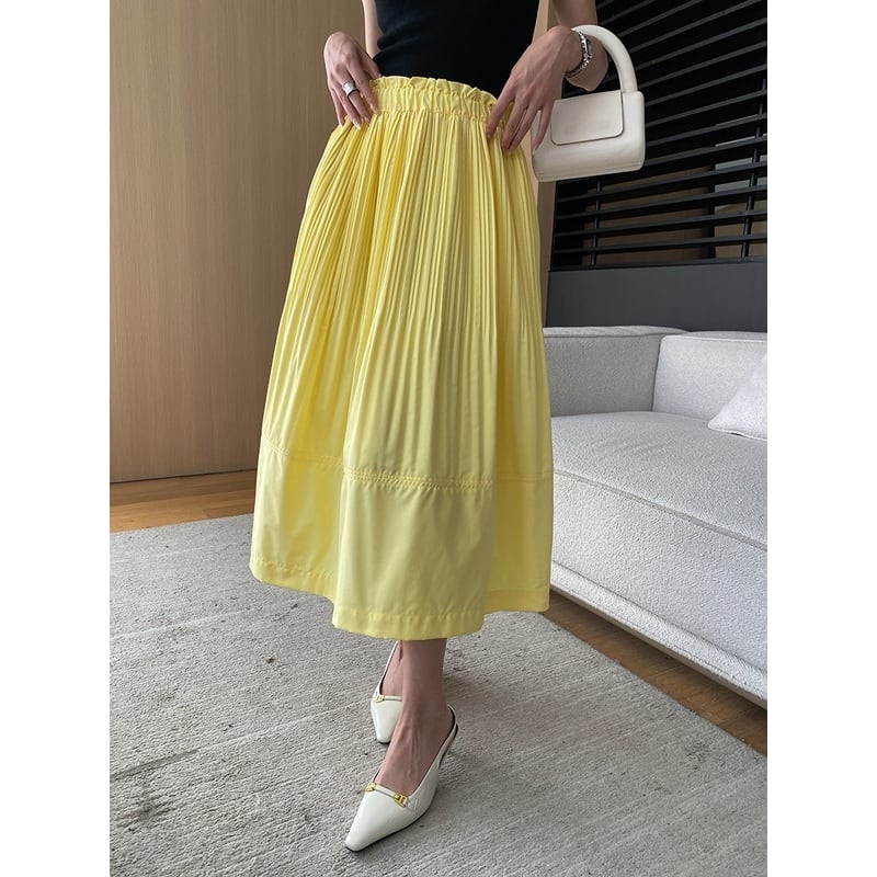 ウエストゴムのギャザーも綺麗に施されているのでトップスインやショート丈のトップスと合わせるのがぴったりです。