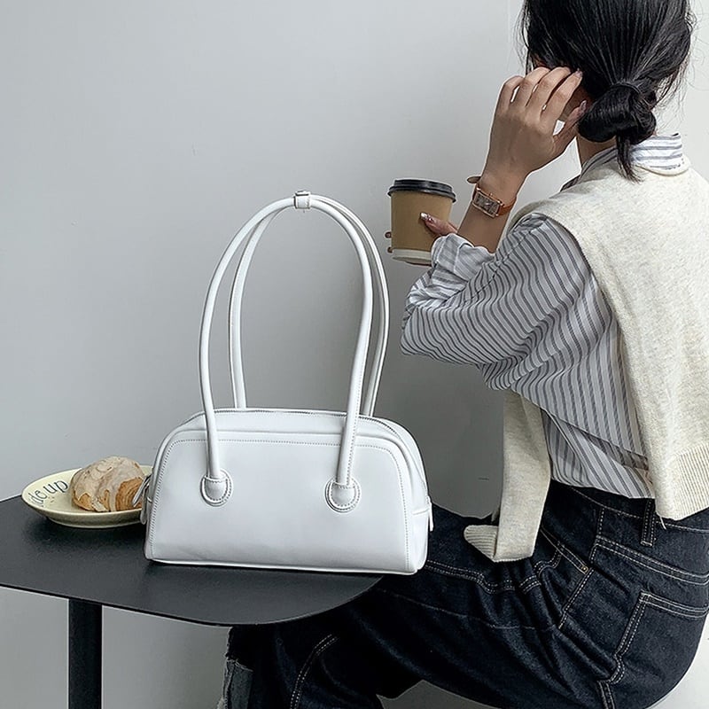 カジュアルコーディネートやオフィススタイルにも合わせやすいコンパクトなショルダーハンドバック。